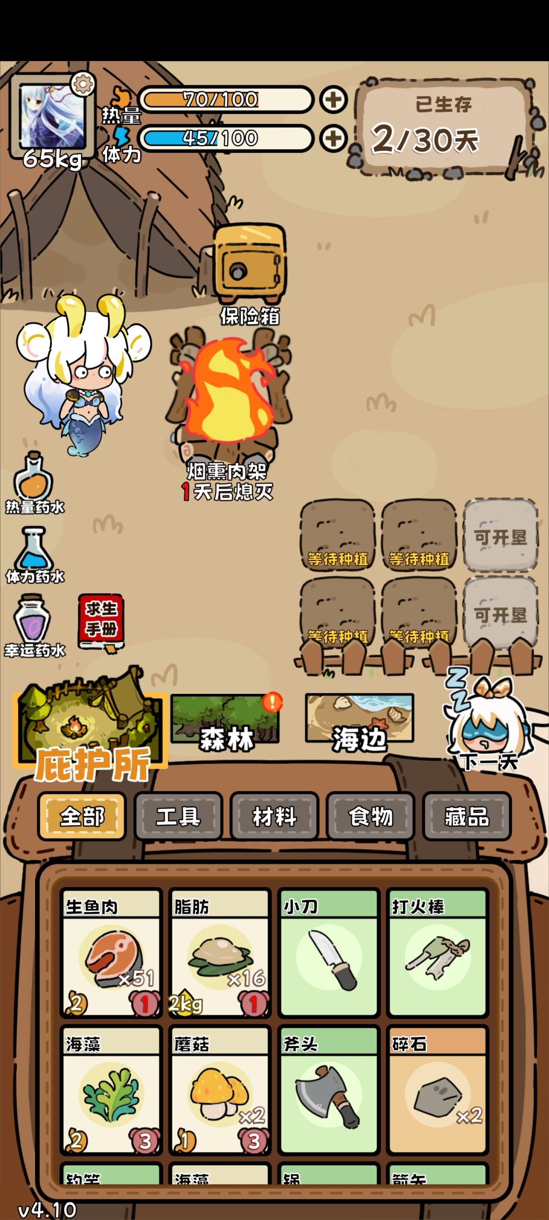 今天刚更新的4.10版本内容调整不少,比较值得关注的一是增加了一些动物,二是30天之后可以继续存活,此外部分数值有所调整。 玩了两局,明显感觉到的变化是: 第一,前期大中型动物减少,陨石流被大幅削弱。两局当中有一局带了陨石,整局只遇到两个大型动物,而且都没捕猎成功,没带陨石的那一局开局刷了一只老虎,后来也再也没遇到大型动物。总的来说,更新之后野外出现的猎物基本以小型动物,前期捕猎收入减少很多。 第