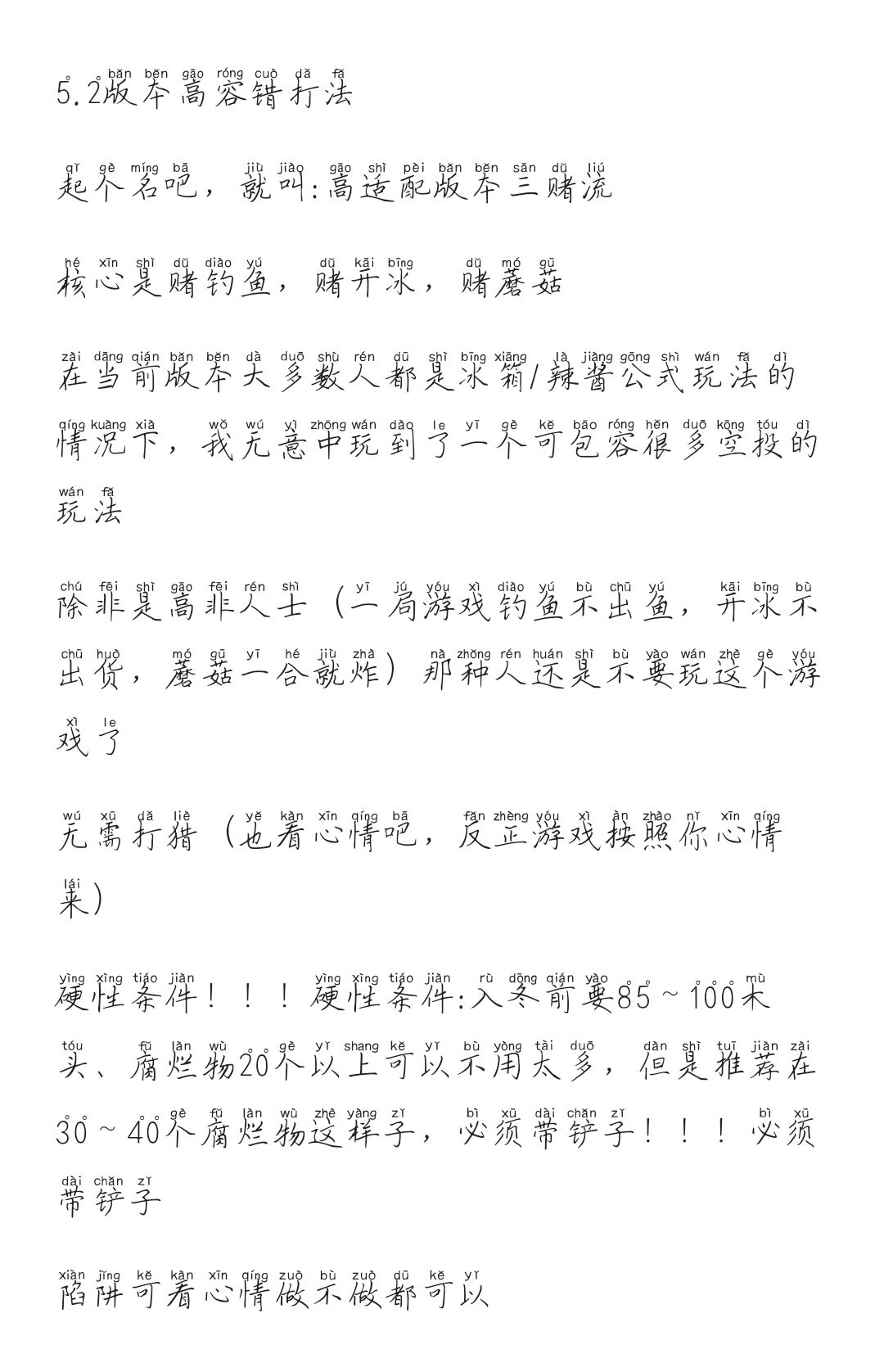 39天镇楼。更新以后试了几次,发现还是这个流派比较稳定,容易过关,而且方便刷开局,希望可以帮助各位刚刚入坑的玩家,具体方法如下 第1次空投拿蓝色鱼饵(最好是磷虾),开局先采石头,把三个陷阱做了,然后一直砍木头,石头有三个就行,第3天钓完以后如果有一两个大型鱼或者大型兽就可以继续,没有就重开。中间的肉都不吃,快过期了做成熏肉,靠脂肪活着,第6天如果有辣椒酱最好,拿辣椒酱,然后就可以开始吃熏肉了,没有