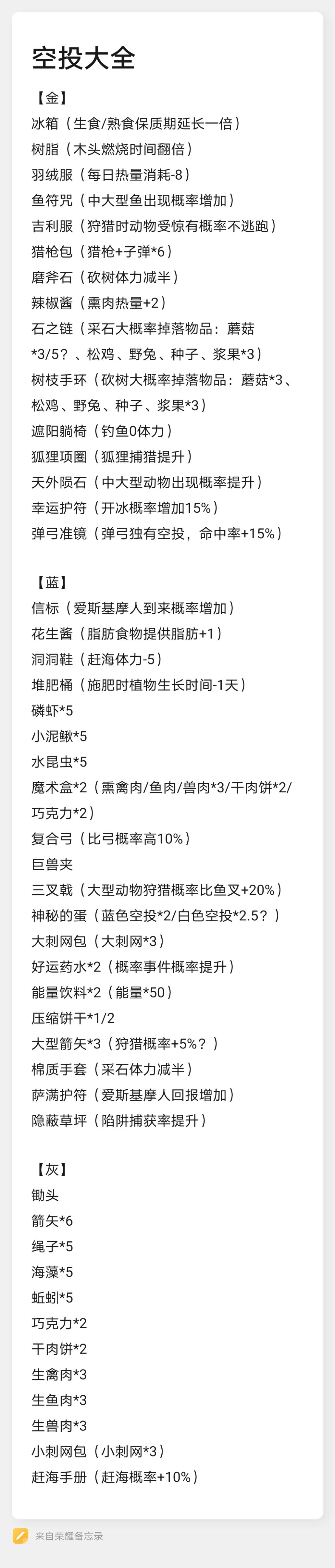 【目前已退坑,数据落后,请当成不能保证准确的参考资料】 【11.29添加和修改了部分空投描述,目前直播版本似乎没有相关新空投。 本次更新大概是最后一次更新,目前现实生活较忙,之后不会再有时间收集信息。】 【11.18,修改了一下[蓝色饵料]、[神秘的蛋]和[压缩饼干]的空投等级。】 (半夜补充了一下概率空投的前后期……) 注意⚠️:空投分析含大量个人主观看法。