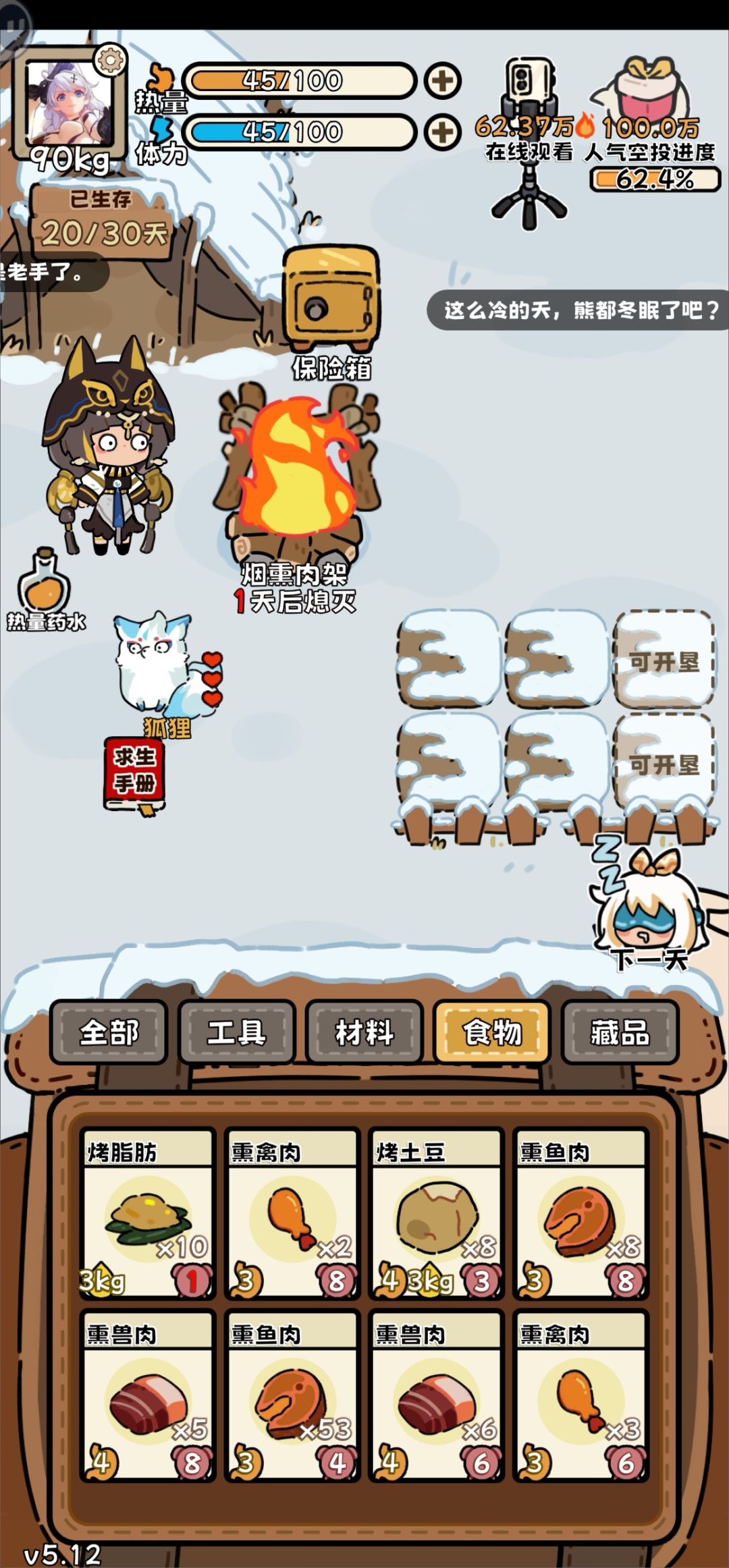 通用空投:羽绒服(热量消耗降低,约平时20冬天30➕)、幸运药水(提升成功率和命中)、能量饮料(2×50体,前期) 通用路径: ①苟:前期食物丰富时菜肉都拖到最后再做,烂前吃。遇熊/豹开熏肉。脂肪消耗约0.5热量差 ②v3.5熟鱼肉➕1,开局躺椅后走钓鱼更容易通关了 ③广告价值:27天左右热量广告(普通可续命2天➕,羽绒服可续命3天➕)>1天能量广告>熊豹时能量广告>其他 ④未成形:熊豹>>砍树>