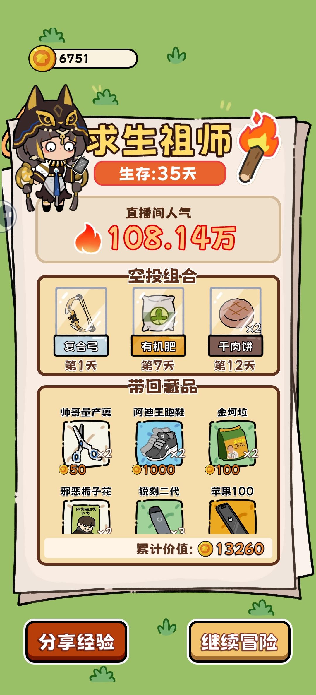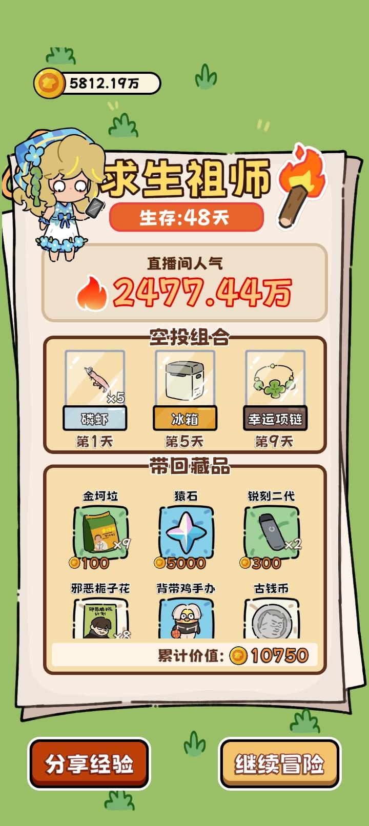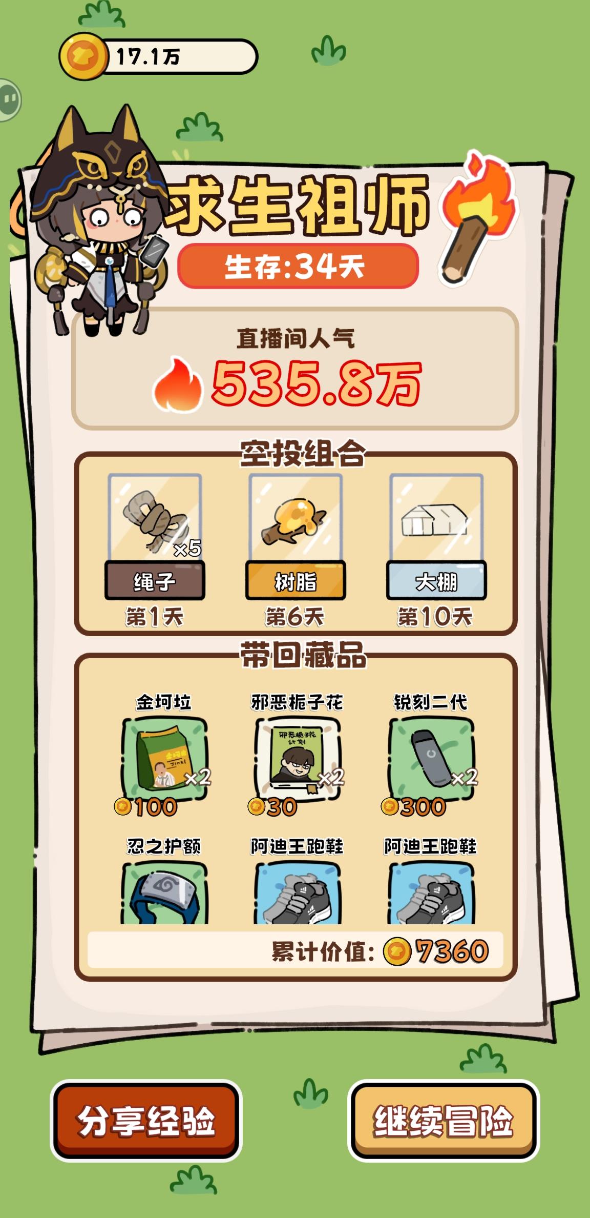 通用空投:羽绒服(热量消耗降低,约平时20冬天30➕)、幸运药水(提升成功率和命中)、能量饮料(2×50体,前期)通用路径:①苟:前期食物丰富时菜肉都拖到最后再做,烂前吃。遇熊/豹开熏肉。脂肪消耗约0.5热量差②v3.5熟鱼肉➕1,开局躺椅后走钓鱼更容易通关了③广告价值:27天左右热量广告(普通可续命2天➕,羽绒服可续命3天➕)>1天能量广告>熊豹时能量广告>其他④未成形:熊豹>>砍树>