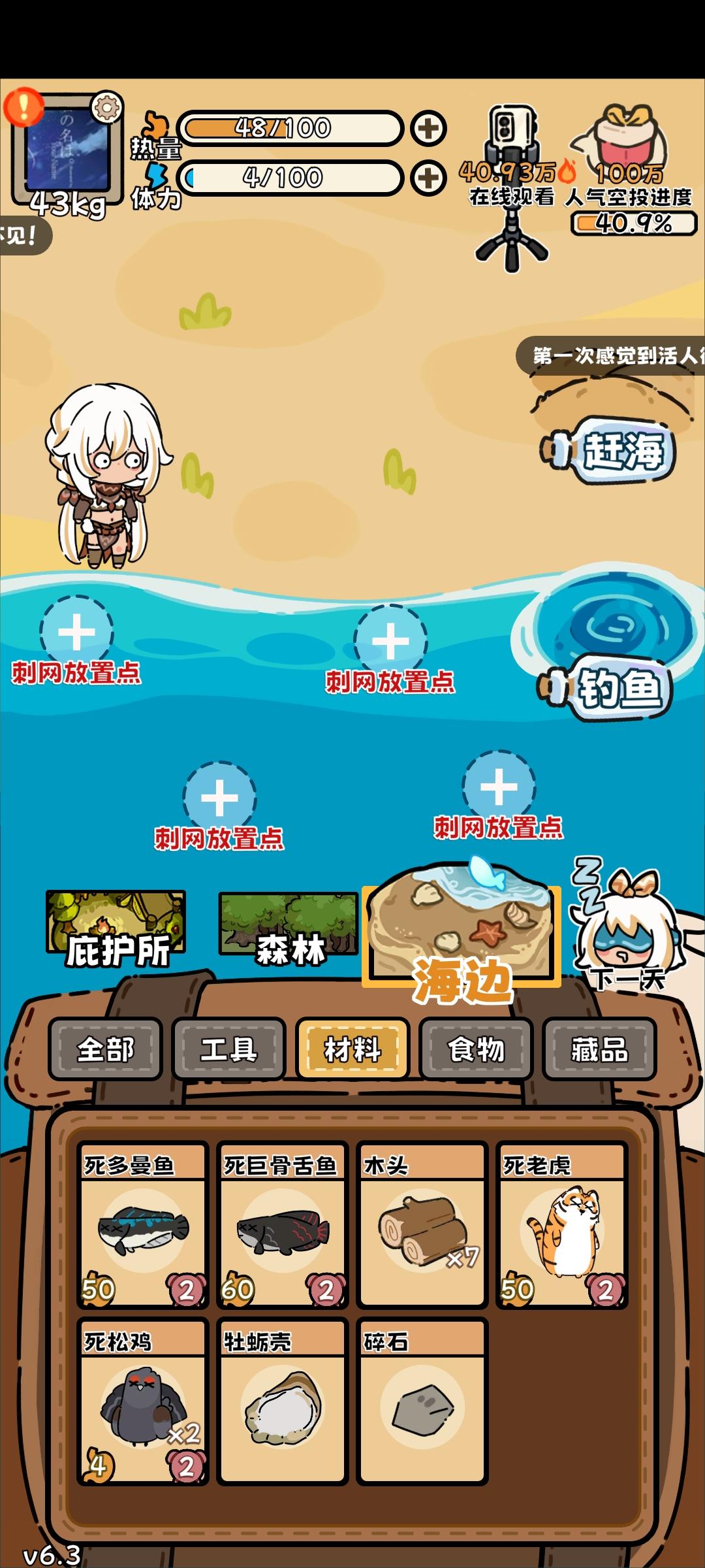 分享一个比较容易过关的套路。带猫猫套称号,赶海有概率翻倍物品的。第一个空投刷白色的,幸运项链和赶海手册,手册优先。第一天采一次石头,看情况造陷阱,至少两个。砍树。蘑菇和海草,不吃。让它们变成腐烂物,留到25天以后后面种蘑菇。第二天,如果第一天有猎物,再采一次石头,生火,煮猎物,等保质期到了再吃。有空余体力造熏肉架。砍树第三天至第六天,有猎物就打,灰躁鸦兔子鳕鱼不打,有体力就砍树,不够体力