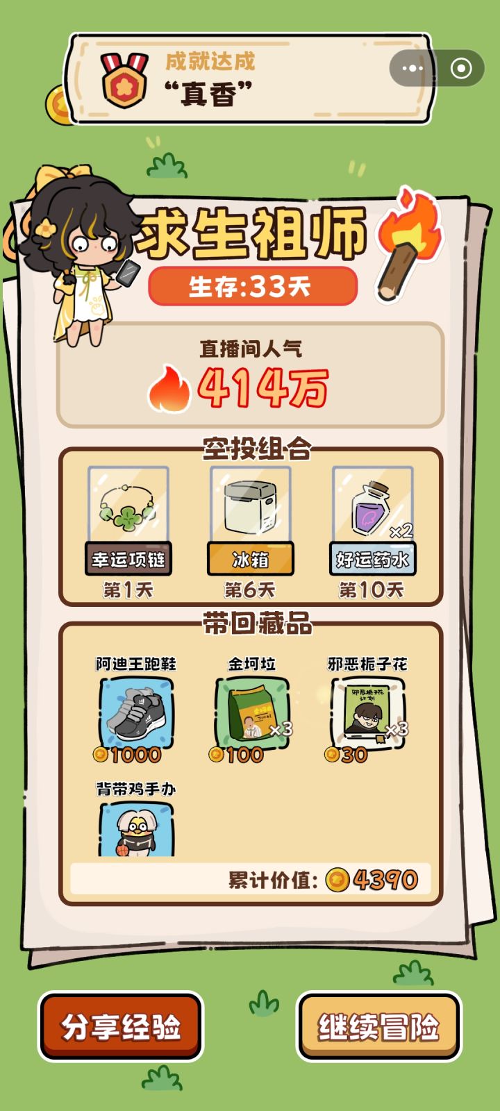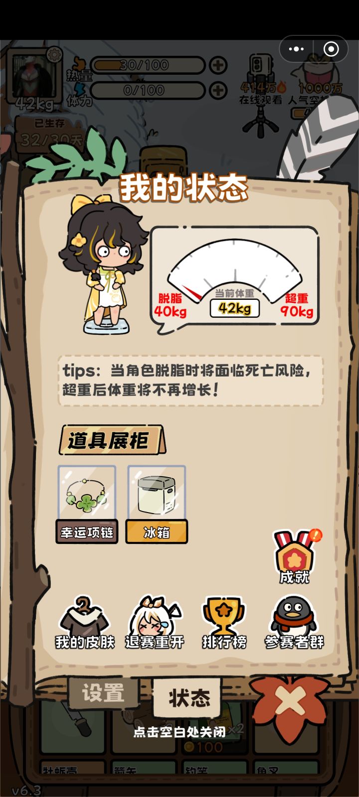 通用空投:羽绒服(热量消耗降低,约平时20冬天30➕)、幸运药水(提升成功率和命中)、能量饮料(2×50体,前期)通用路径:①苟:前期食物丰富时菜肉都拖到最后再做,烂前吃。遇熊/豹开熏肉。脂肪消耗约0.5热量差②v3.5熟鱼肉➕1,开局躺椅后走钓鱼更容易通关了③广告价值:27天左右热量广告(普通可续命2天➕,羽绒服可续命3天➕)>1天能量广告>熊豹时能量广告>其他④未成形:熊豹>>砍树>