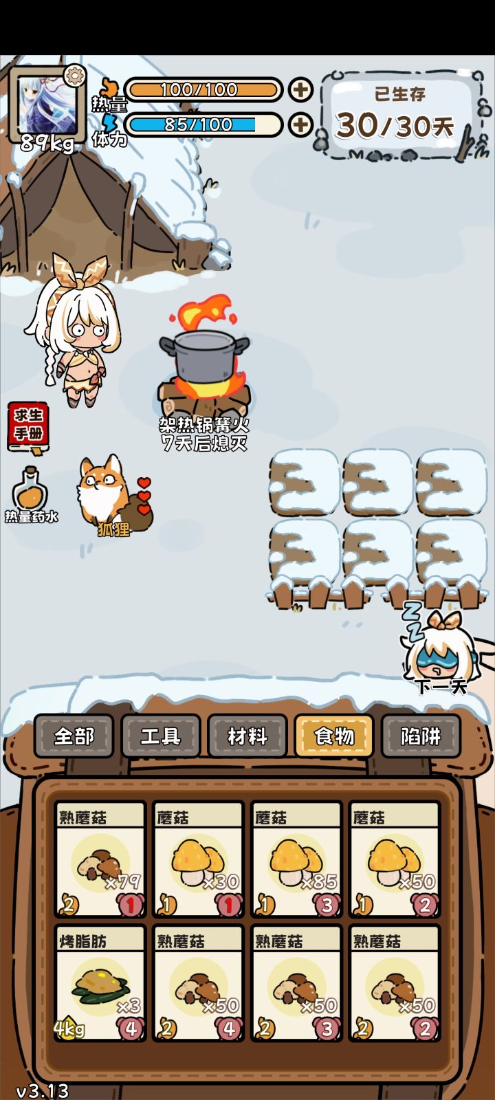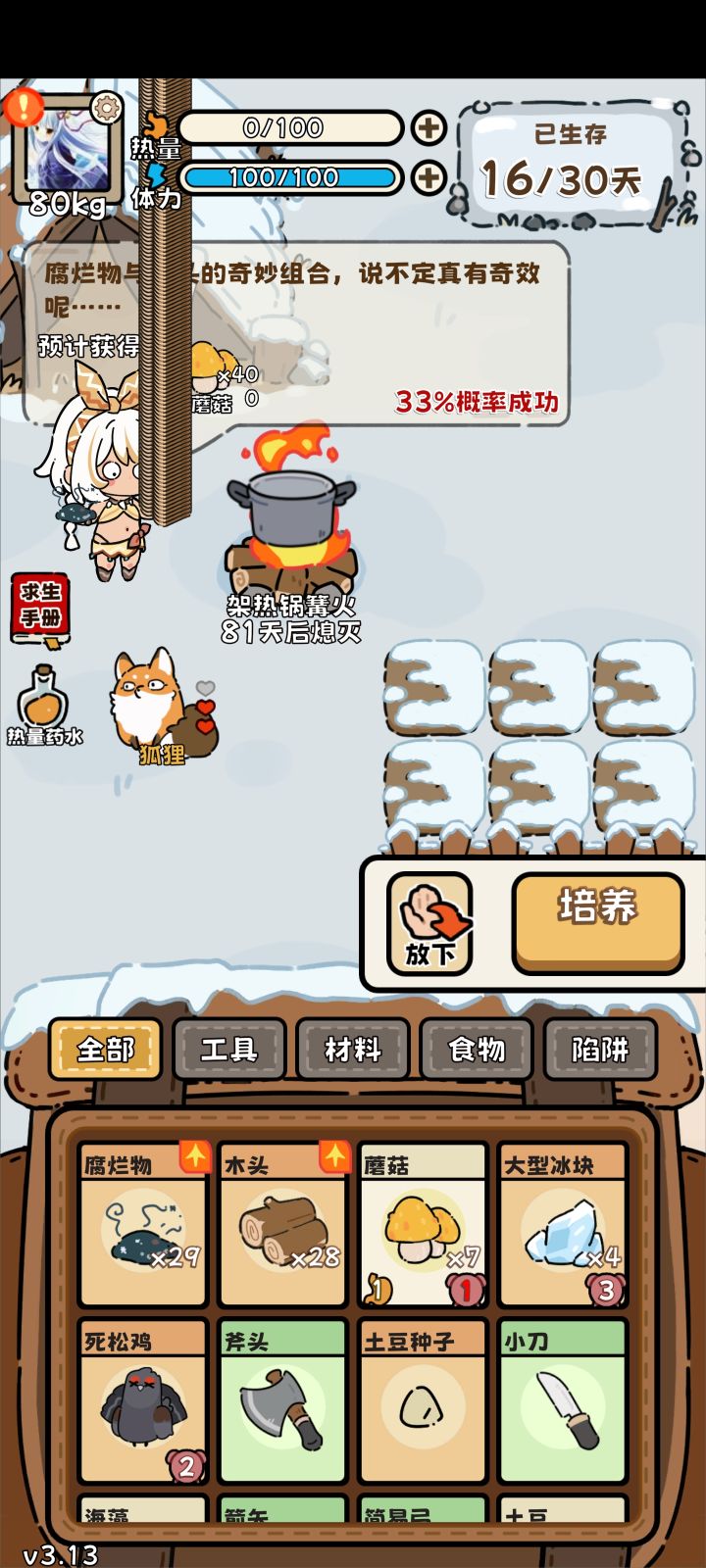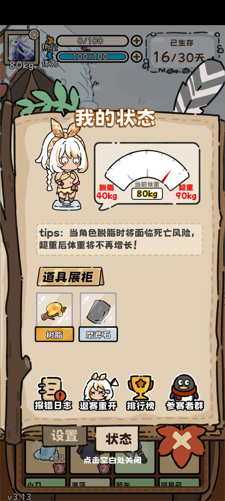 通用空投:羽绒服(热量消耗降低,约平时20冬天30➕)、幸运药水(提升成功率和命中)、能量饮料(2×50体,前期)通用路径:①苟:前期食物丰富时菜肉都拖到最后再做,烂前吃。遇熊/豹开熏肉。脂肪消耗约0.5热量差②v3.5熟鱼肉➕1,开局躺椅后走钓鱼更容易通关了③广告价值:27天左右热量广告(普通可续命2天➕,羽绒服可续命3天➕)>1天能量广告>熊豹时能量广告>其他④未成形:熊豹>>砍树>