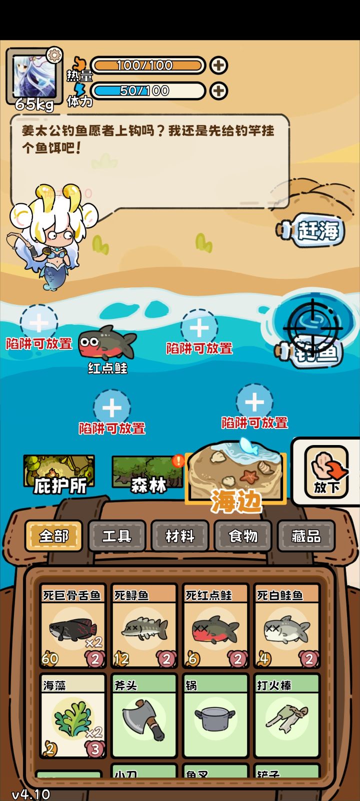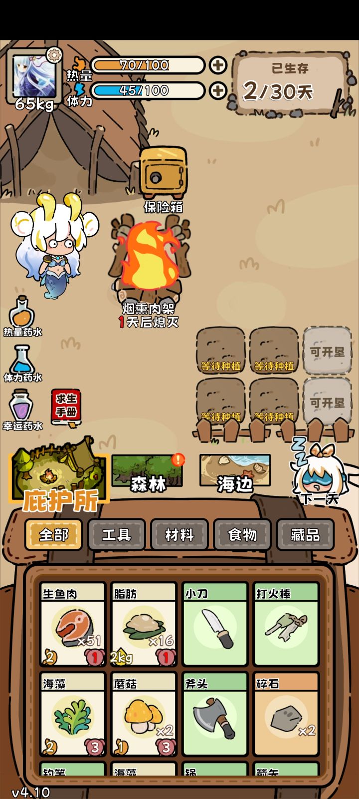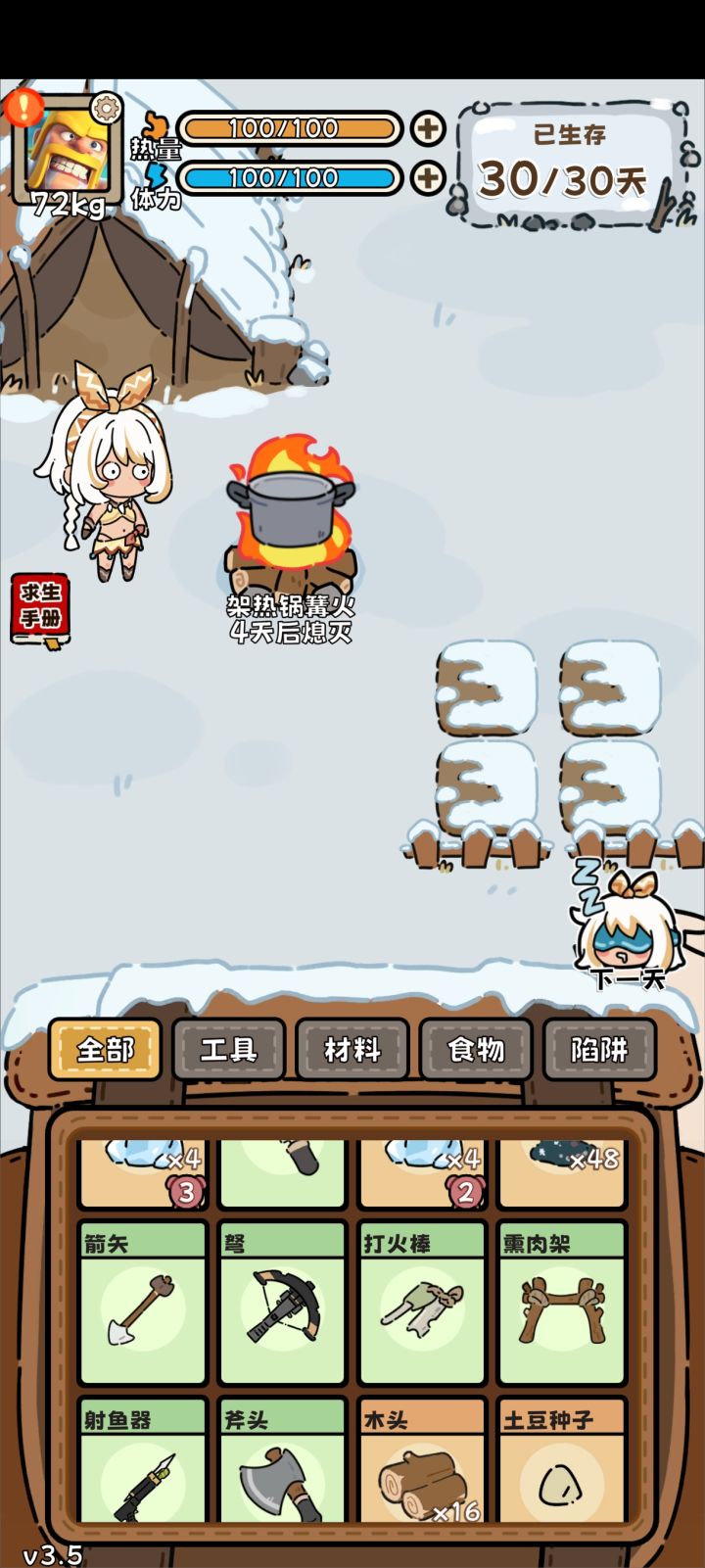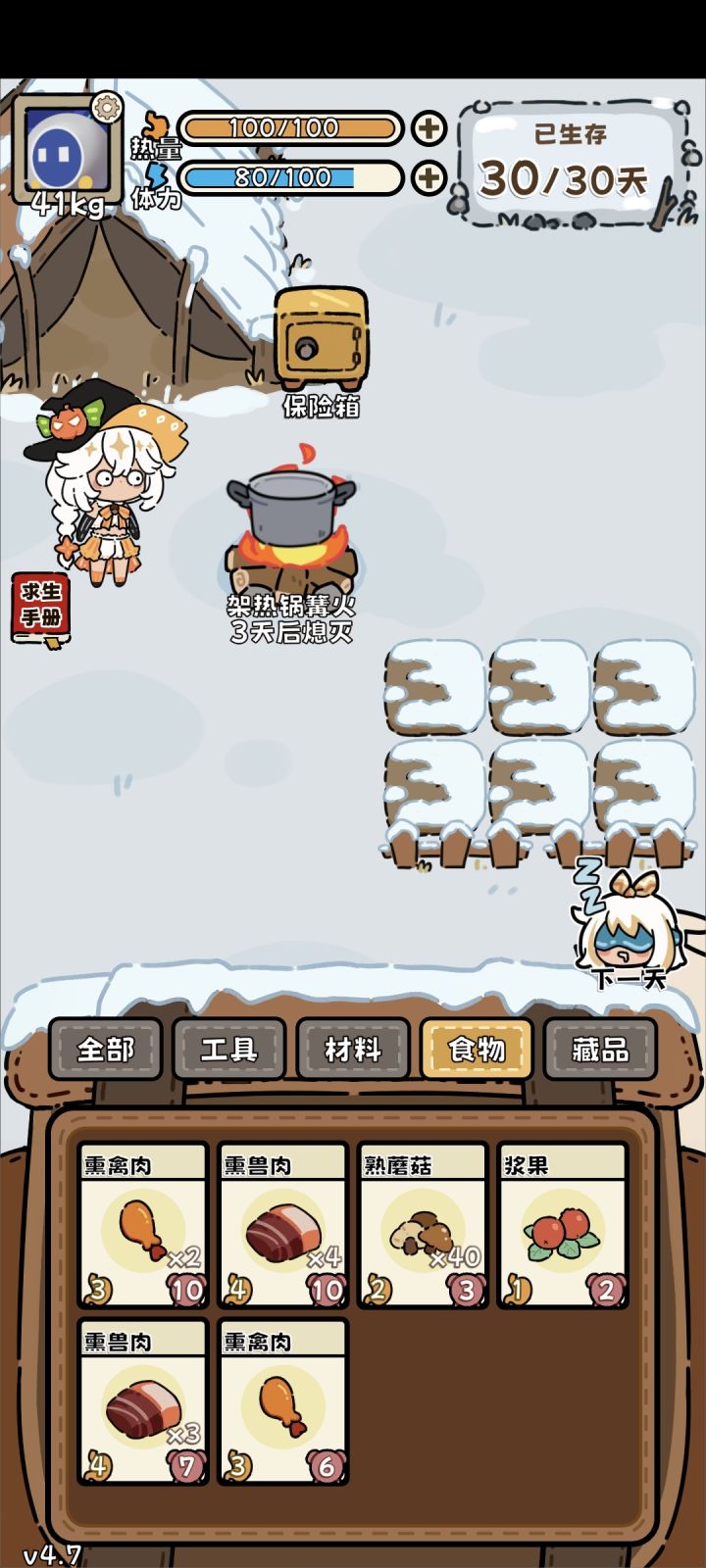 🎮可玩性:玩法结构有些简单的生存类小游戏,维持体重不掉称其实就可以了,目标就是活下去,比同类游戏要维持四维或五维属性简单得多。每一天有体力值限制,而且会自然损耗热量,维持热量需要食物,初始装备很多,例如弓箭可以射杀动物获得肉类,海边可以用鱼叉打鱼,但需要看到目标。动物出现有一定随机性,完全的生食材无法满足热量消耗,做熟了吃才是最佳方案。过天的时候会提示距离寒潮还有多少天,需要提前准备物资应付