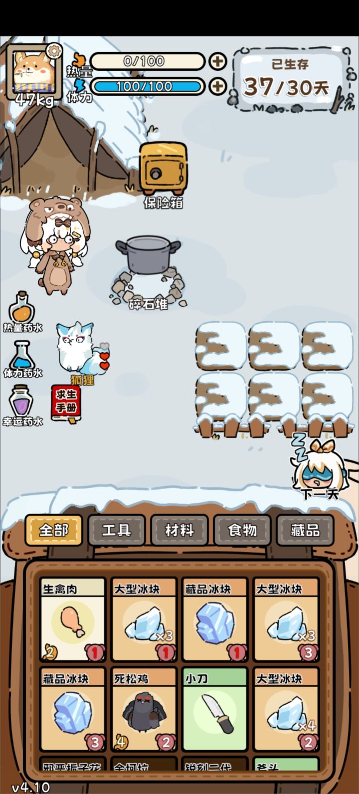本次推荐新人最易上手流派-辣椒酱流派玩法核心1、开局、第6天、第10天空投选择要以:白/蓝+白/蓝+金的顺序选,这样的好处是在前两次空投拿白或蓝,第11天的空投一定会有辣椒酱玩法核心2、开局空投不需要看广告,拿完后空投后查看第一天是否有熊或海豹,如果没有重新开局,如果没打下也重新开局--简单说一定要保证熊豹开局玩法核心3、全程所有食物全部烧烤处理,前9天不吃除含脂肪以外的食物玩法注意4、空