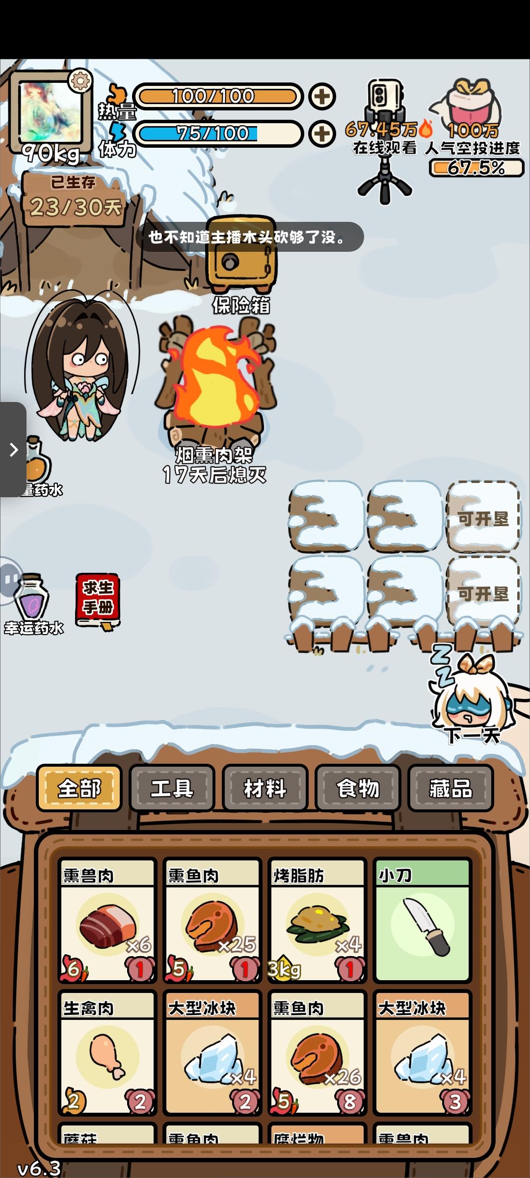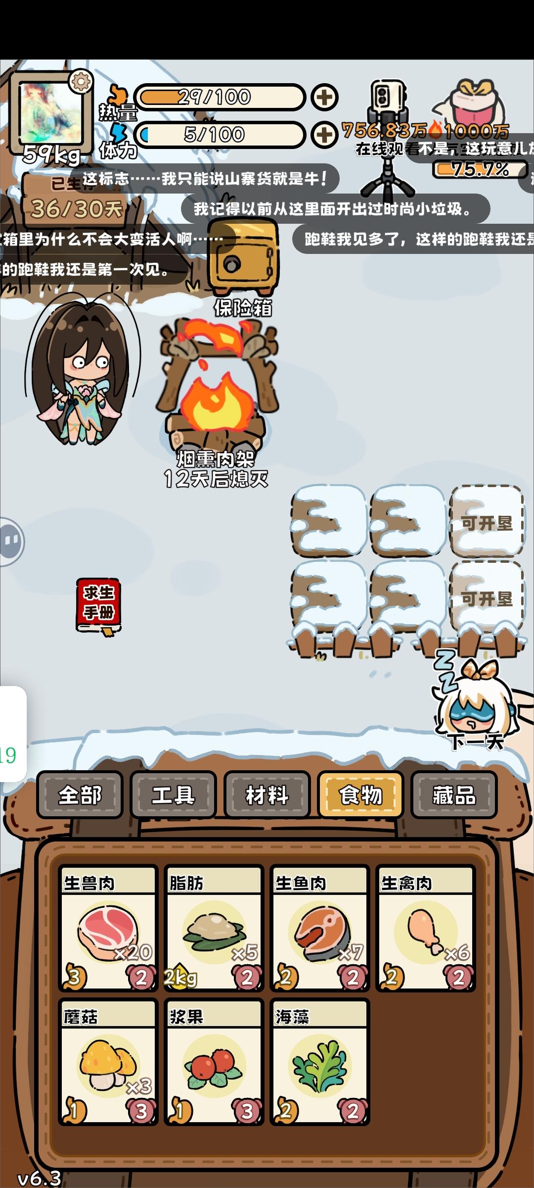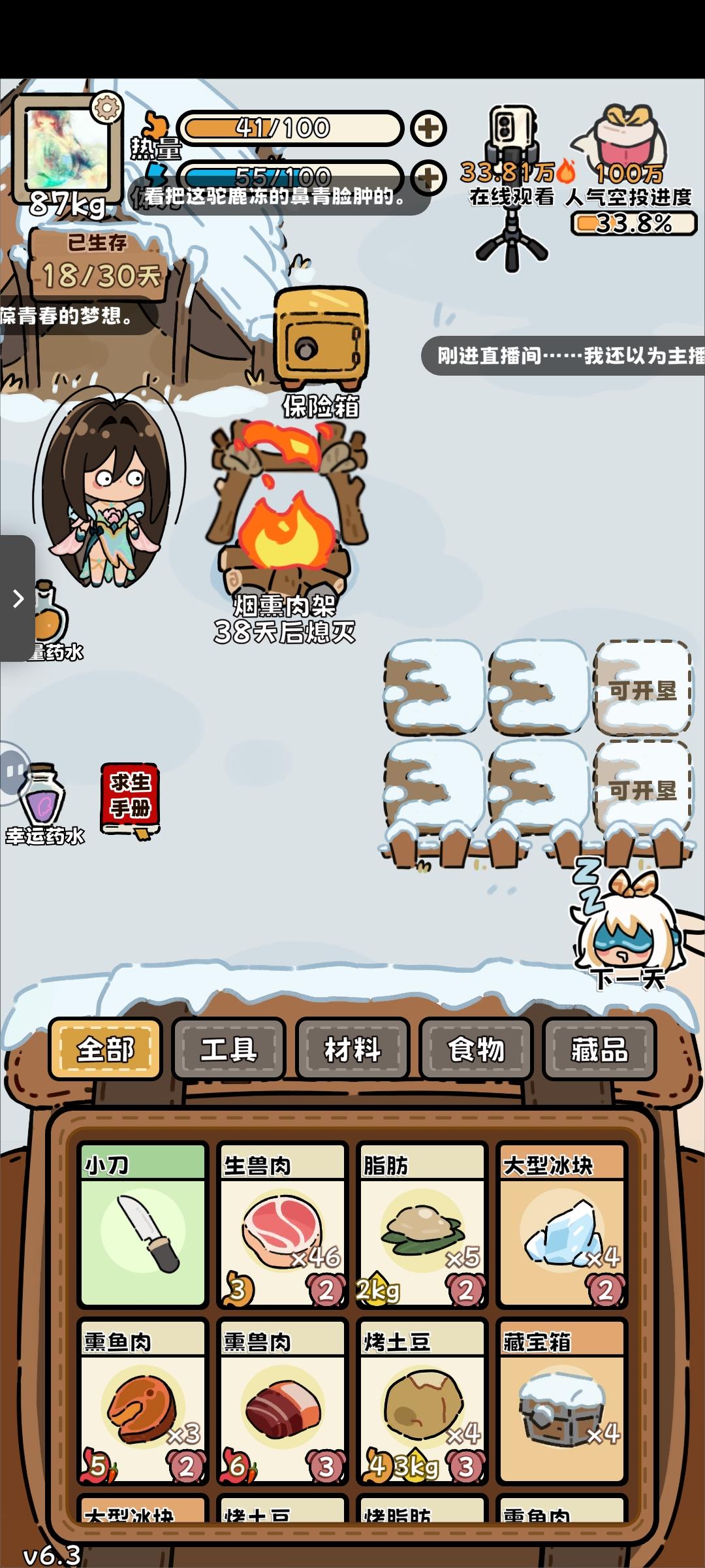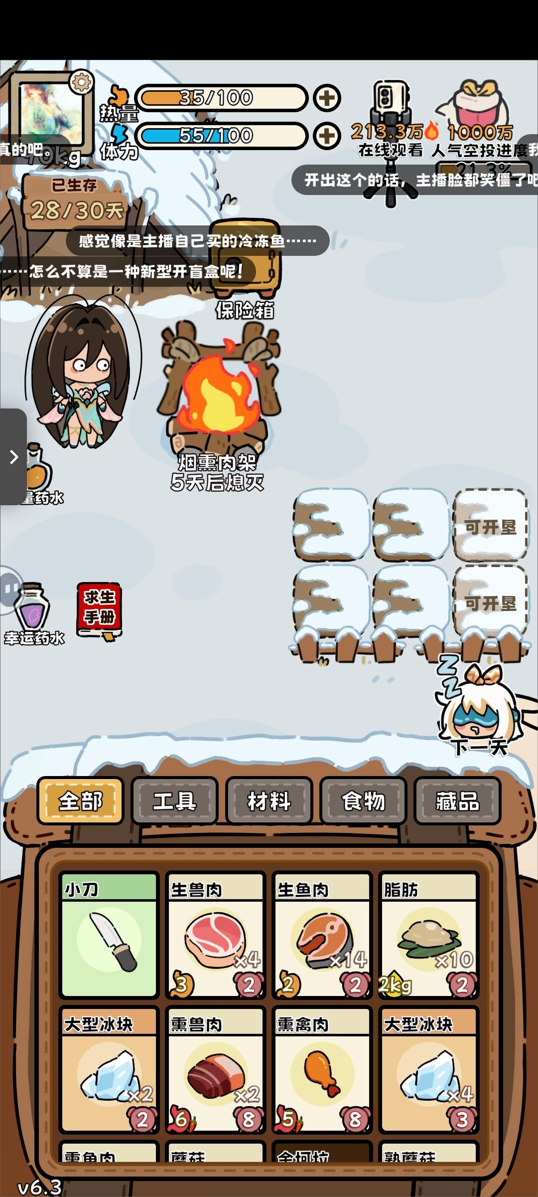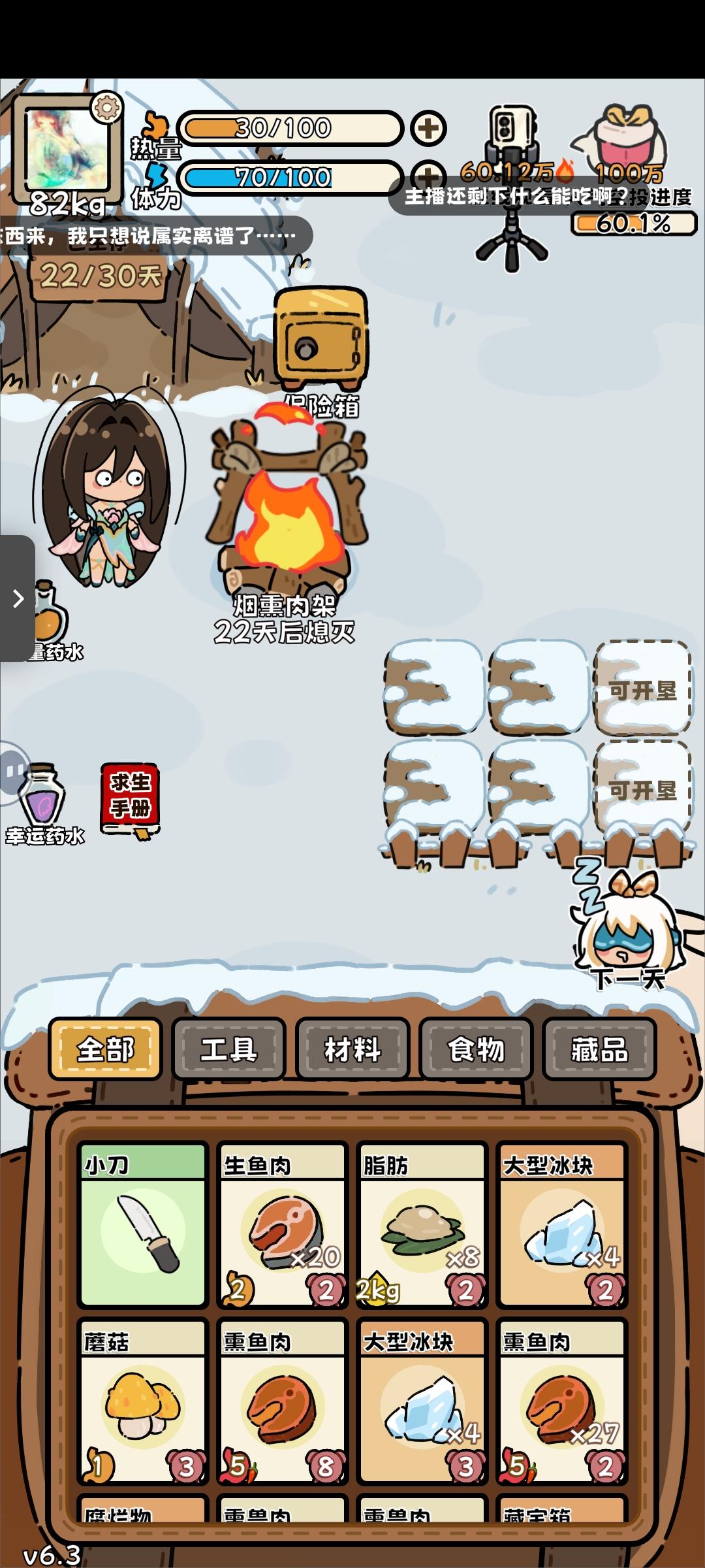 回游第一局(这真的是刚过完新手教程的第一局啊啊啊,太欧了)后面才反应过来录像和截屏,前面大部分动物没有录上。(录像录的很墨迹,仅为纪念) 最后竟然是因为忘记屯木头才失败了(懊恼中) …先是开出了个弓箭,命中率很高,然后就获得大型动物:老虎一只,熊一只,巨骨舌鱼、死多鳗鱼共三条,小动物若干。(导致后期吃都吃不完,腐烂物老多,但凡多屯几十个木头,搞吃蘑菇都能撑到30天…) (第14.15天时忘记喂狐狸