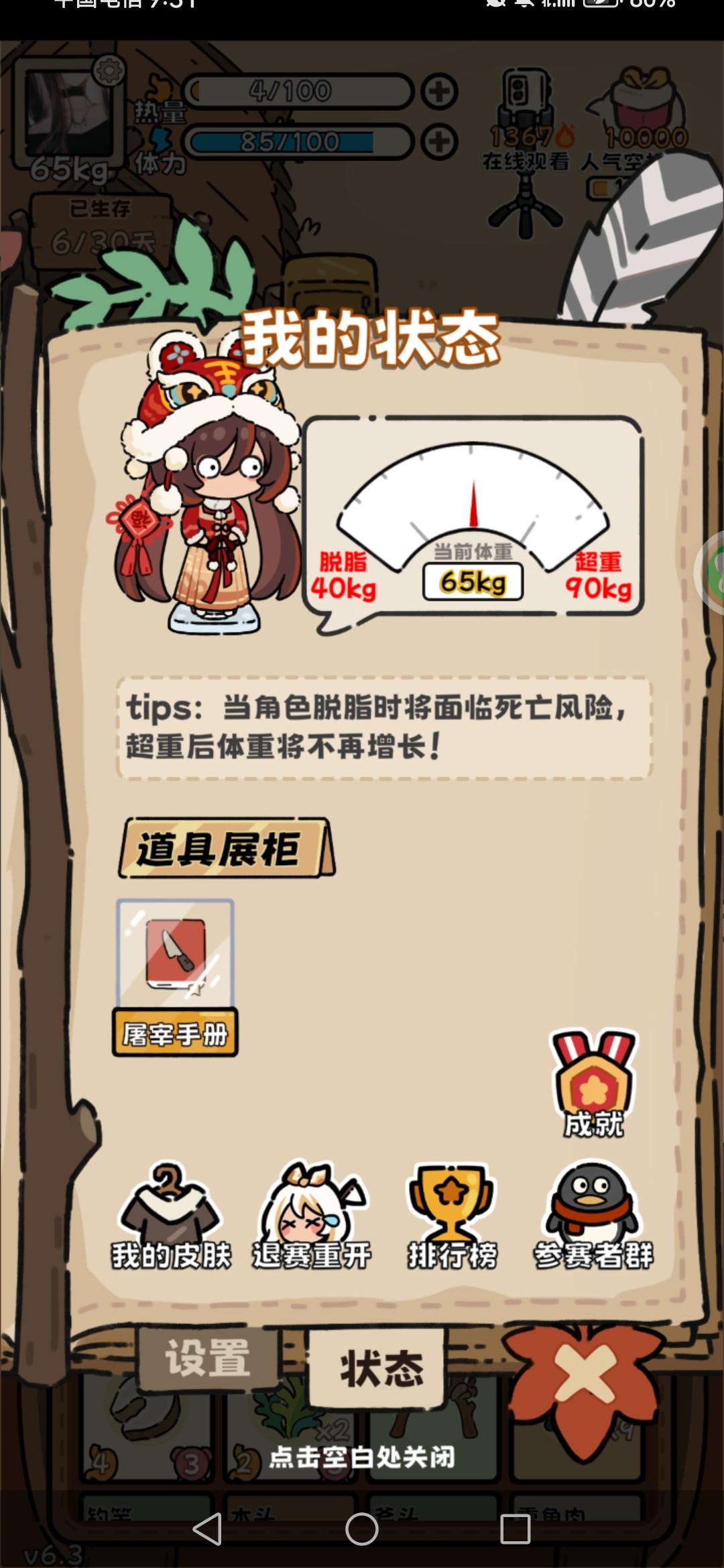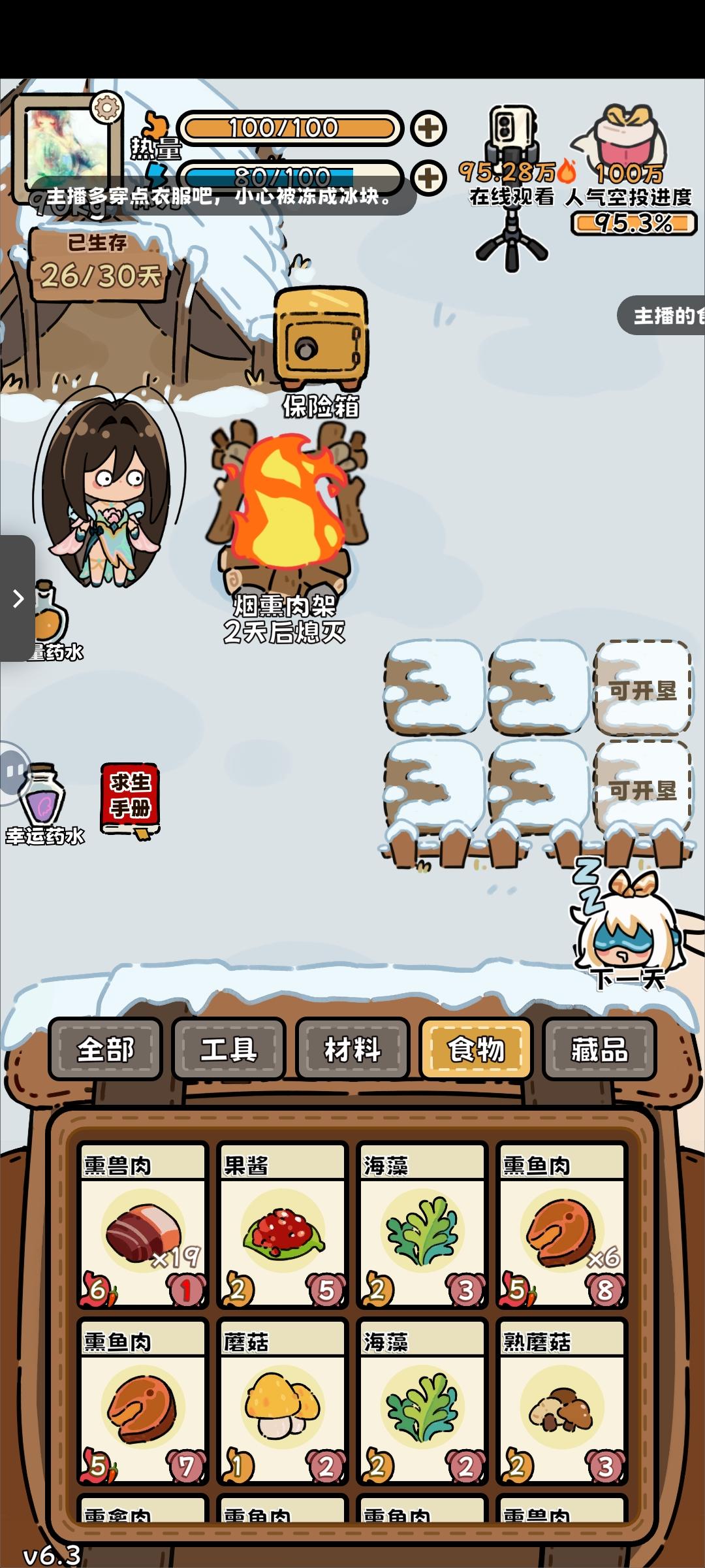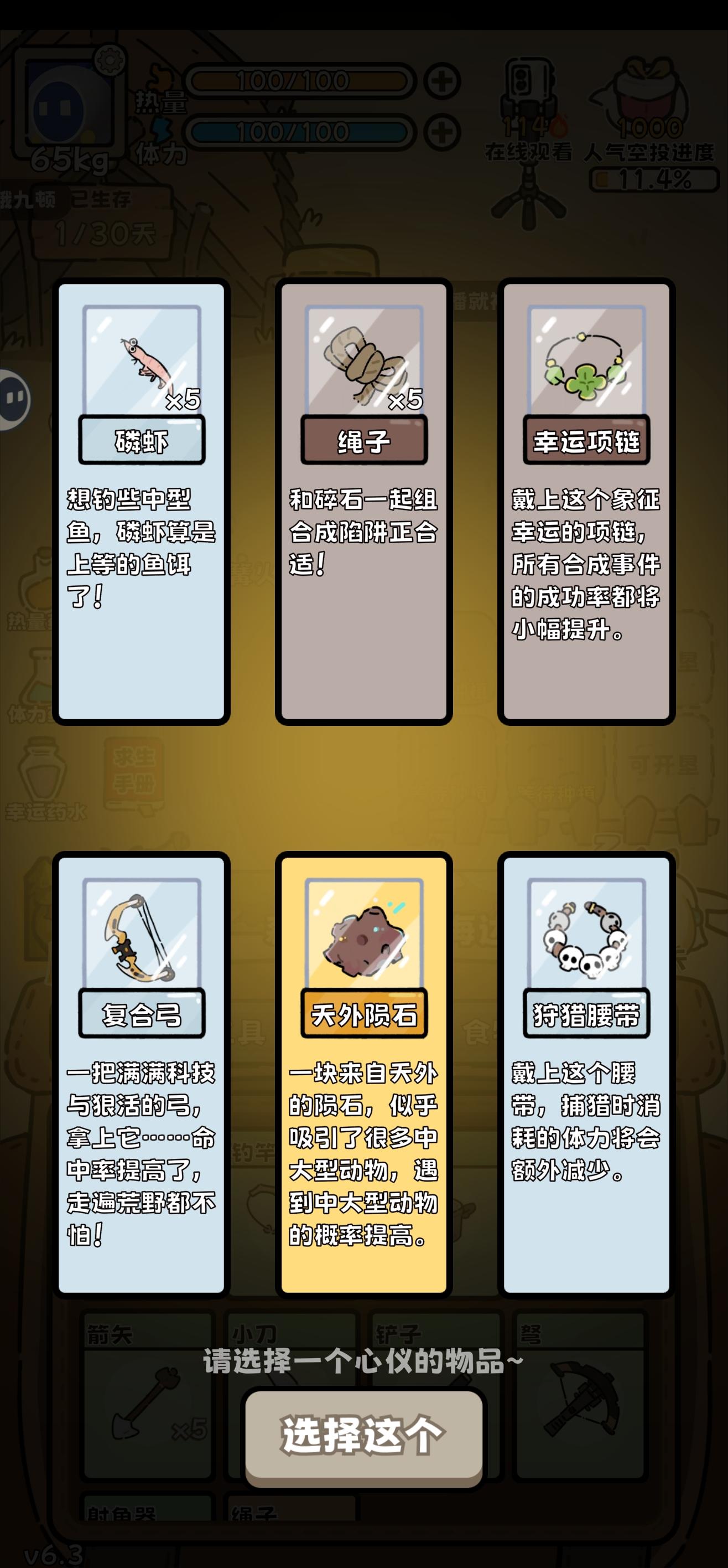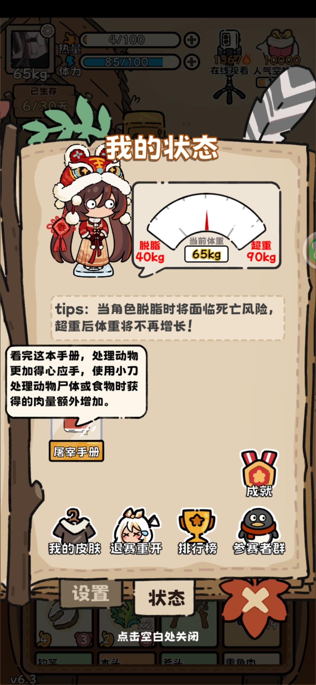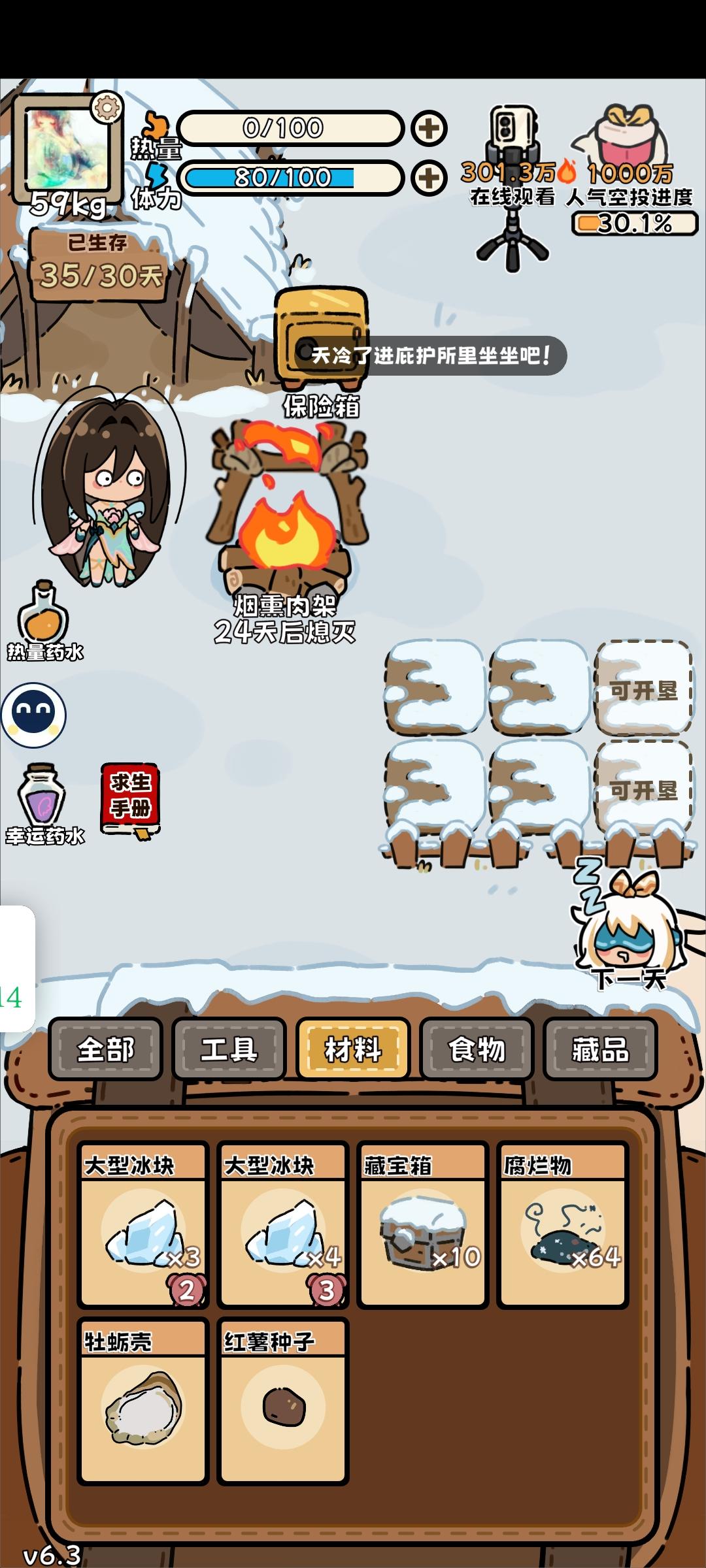 回游第一局(这真的是刚过完新手教程的第一局啊啊啊,太欧了)后面才反应过来录像和截屏,前面大部分动物没有录上。(录像录的很墨迹,仅为纪念) 最后竟然是因为忘记屯木头才失败了(懊恼中) …先是开出了个弓箭,命中率很高,然后就获得大型动物:老虎一只,熊一只,巨骨舌鱼、死多鳗鱼共三条,小动物若干。(导致后期吃都吃不完,腐烂物老多,但凡多屯几十个木头,搞吃蘑菇都能撑到30天…) (第14.15天时忘记喂狐狸