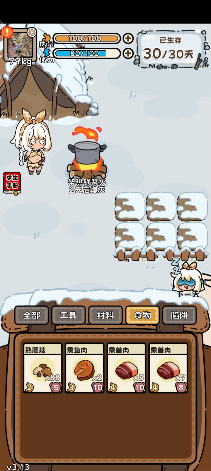 众所周知,30天后能活多久完全取决于开冰能开不能开出大型猎物,不管是辣酱冰箱还是羽绒服,后期冰里开不出大猎物也多苟不了一两天。前期白蓝随便选都是过渡,选到幸运护符相当于全程自带幸运合剂,只要脸不是太黑,基本可以保证攒三天的10+块冰里至少能出一头大猎物+五头小猎物,出的肉+脂肪至少可以顶两天。在此期间只要能来一次爱斯基摩老哥,就可以再攒三天冰开一头大猎物开启新一轮。自从选了幸运护符,基本生存时间就