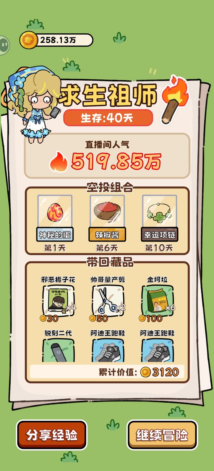 通用空投:羽绒服(热量消耗降低,约平时20冬天30➕)、幸运药水(提升成功率和命中)、能量饮料(2×50体,前期)通用路径:①苟:前期食物丰富时菜肉都拖到最后再做,烂前吃。遇熊/豹开熏肉。脂肪消耗约0.5热量差②v3.5熟鱼肉➕1,开局躺椅后走钓鱼更容易通关了③广告价值:27天左右热量广告(普通可续命2天➕,羽绒服可续命3天➕)>1天能量广告>熊豹时能量广告>其他④未成形:熊豹>>砍树>