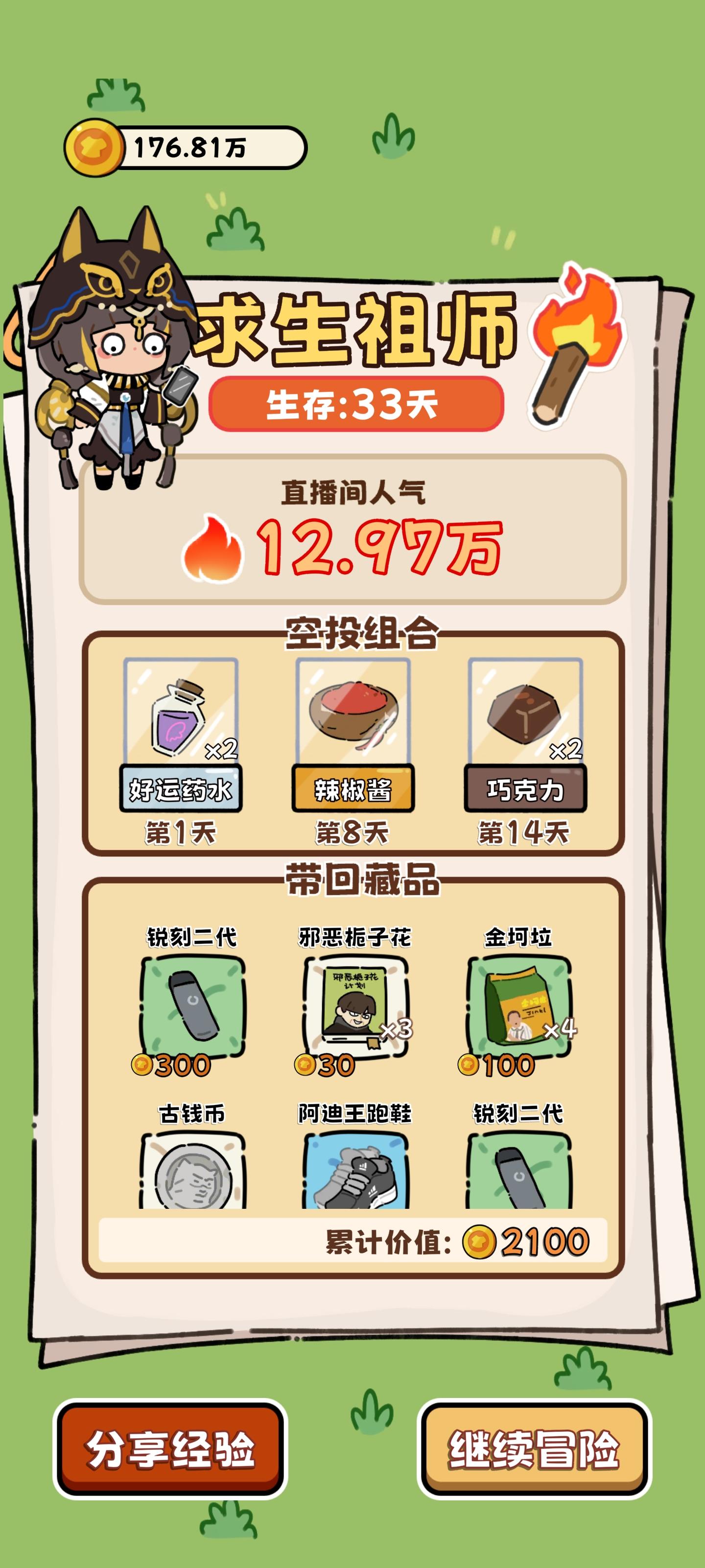通用空投:羽绒服(热量消耗降低,约平时20冬天30➕)、幸运药水(提升成功率和命中)、能量饮料(2×50体,前期)通用路径:①苟:前期食物丰富时菜肉都拖到最后再做,烂前吃。遇熊/豹开熏肉。脂肪消耗约0.5热量差②v3.5熟鱼肉➕1,开局躺椅后走钓鱼更容易通关了③广告价值:27天左右热量广告(普通可续命2天➕,羽绒服可续命3天➕)>1天能量广告>熊豹时能量广告>其他④未成形:熊豹>>砍树>