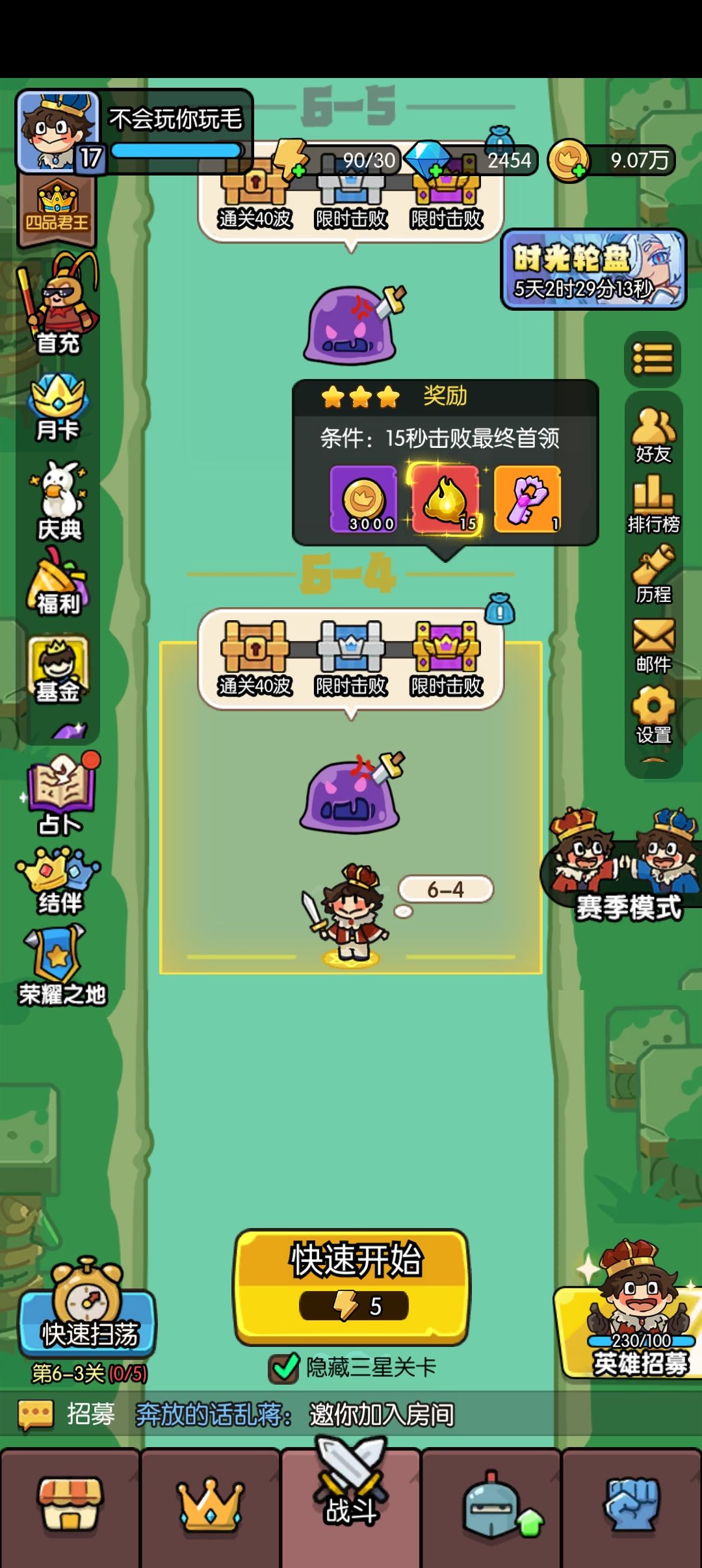 新手攻略 零氪也能玩,首先你要养俩一个主C一个副C,开局只招募主C,副C一倍召唤先用着,第三天会出限定招募,只要有大佬带你过了困难,你主C不用冲一毛钱就可以51级,基本都是领活动日常奖励,然后就培养副C,主要也看你钻石也看运气,有的人三倍一次就中,反正我是没中过。简单过了一般也不会去刷,困难怪物80再召唤因为能多领200银币,第十关BOSS要等另一个BOSS出现再打,这样会多领三个祈愿币,这个很多