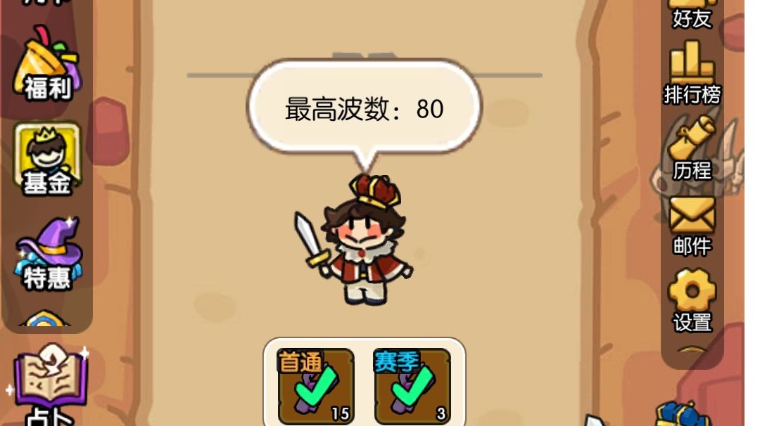 #新手攻略 经过这几天实际操作个人不才发现可以自强过赛季困难80 目前可以稳定的过赛季困难80!需要配合!看图1,图2.零氪党想过赛季困难80,红卡只培养凤凰,明剑!!!(我自己凤凰48.明剑29),藏品需要金库!(有的话更容易,主要吃利息!)下面说下具体运营思路和站位 首先有等小兵有80个后下国王,然后就攒钱!多余的币可以抽紫色祈愿,前25波一分不花就靠国王和祈愿币抽的紫色英雄过度,等