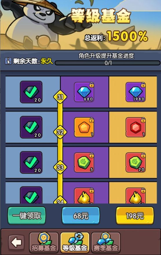 今天给大家分享一下基金活动基金具体介绍 【基金种类】 基金种类是分为3种:招募基金,等级基金,赛季基金,这边给大家分类详细介绍。 【招募基金】 招募基金活动是有时限的,时限一到就会刷新重置,时限为30天,所以要在时限内拿满奖励,奖励是分为2个档位,免费,98元档位 98元档位奖励: 【等级基金】 等级基金活动就不同了,时限是永久,是有分阶段的,一阶段是5级到30级,二阶段是31级到70级一阶段,奖