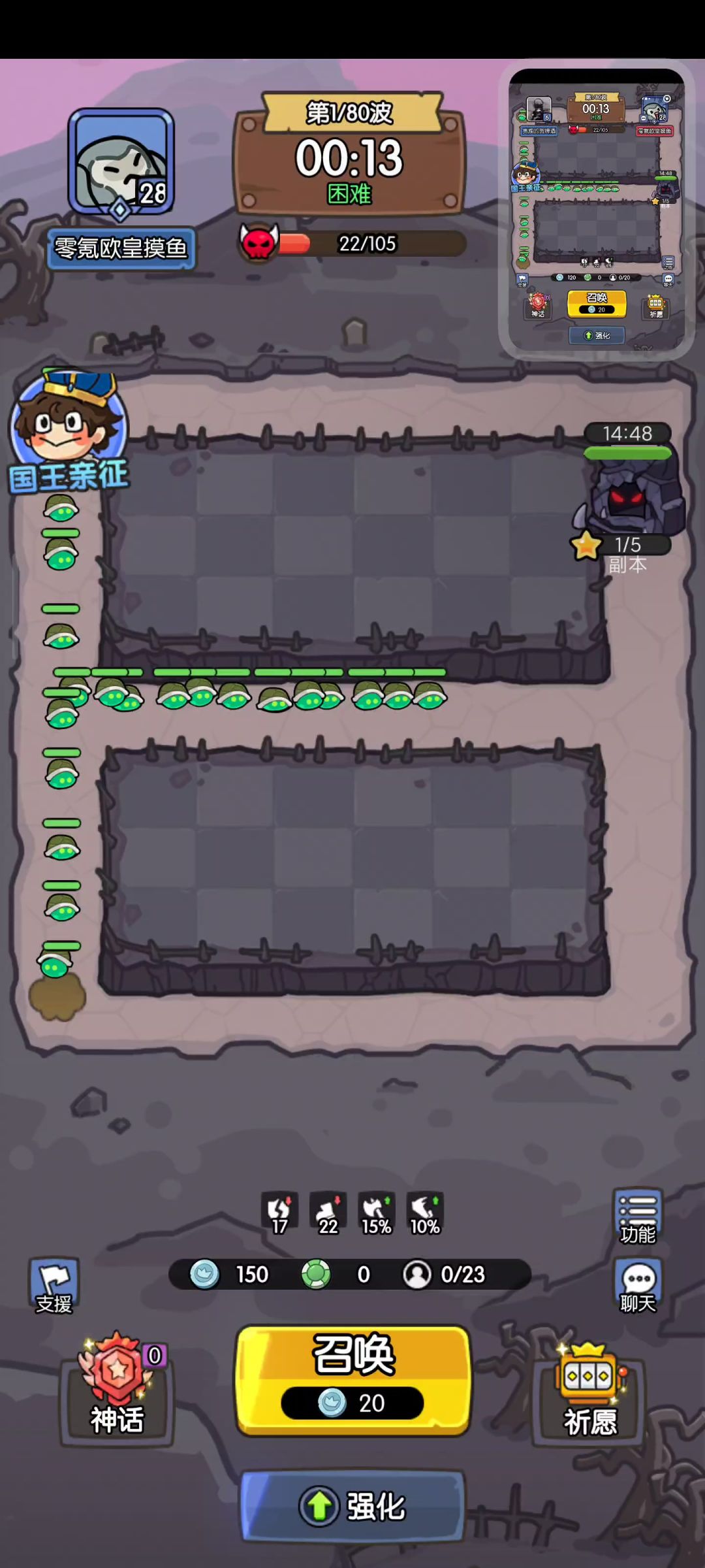 #新手攻略 经过这几天实际操作个人不才发现可以自强过赛季困难80 目前可以稳定的过赛季困难80!需要配合!看图1,图2.零氪党想过赛季困难80,红卡只培养凤凰,明剑!!!(我自己凤凰48.明剑29),藏品需要金库!(有的话更容易,主要吃利息!)下面说下具体运营思路和站位 首先有等小兵有80个后下国王,然后就攒钱!多余的币可以抽紫色祈愿,前25波一分不花就靠国王和祈愿币抽的紫色英雄过度,等