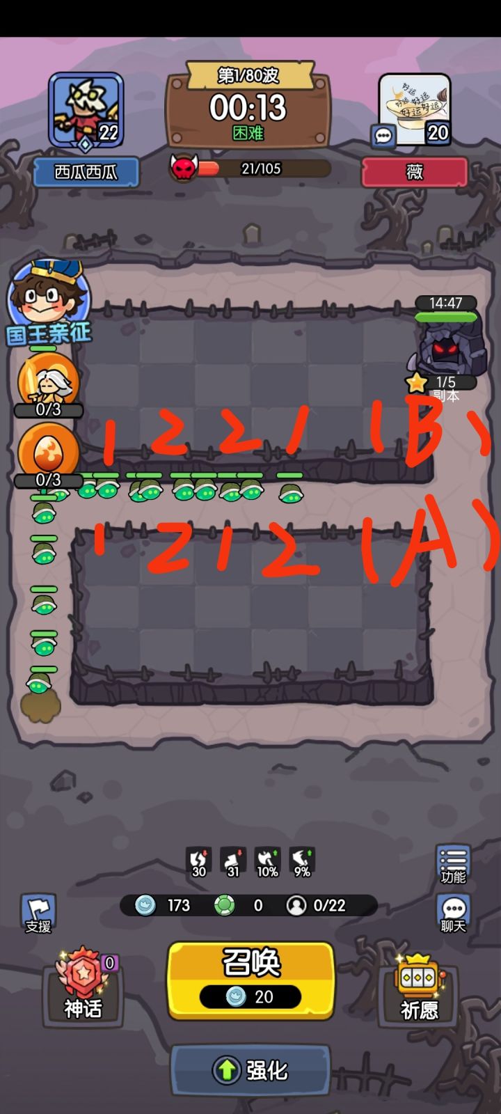 #新手攻略 经过这几天实际操作个人不才发现可以自强过赛季困难80 目前可以稳定的过赛季困难80!需要配合!看图1,图2.零氪党想过赛季困难80,红卡只培养凤凰,明剑!!!(我自己凤凰48.明剑29),藏品需要金库!(有的话更容易,主要吃利息!)下面说下具体运营思路和站位 首先有等小兵有80个后下国王,然后就攒钱!多余的币可以抽紫色祈愿,前25波一分不花就靠国王和祈愿币抽的紫色英雄过度,等