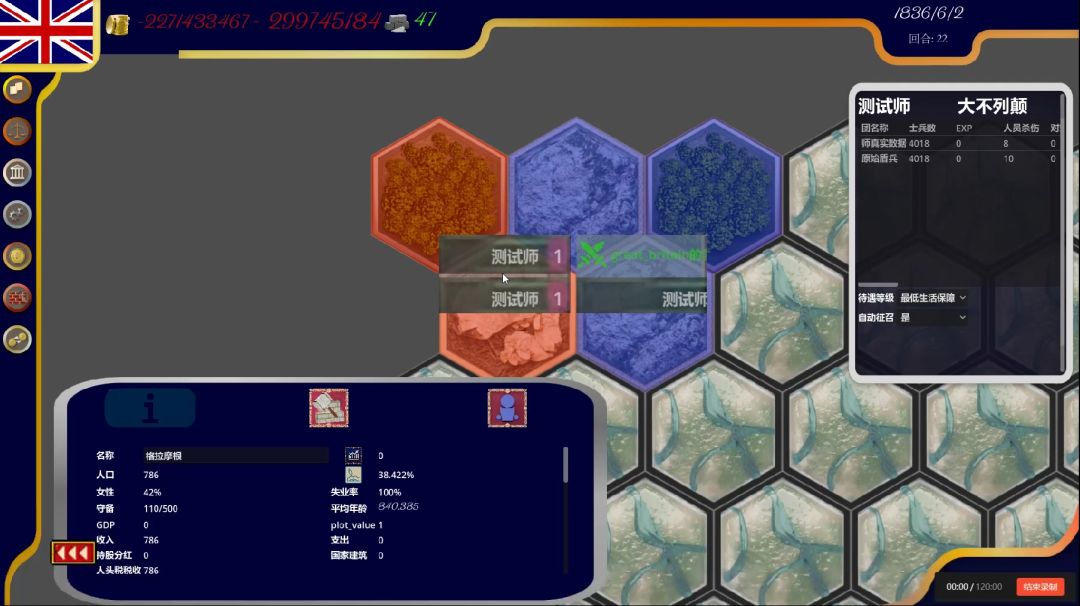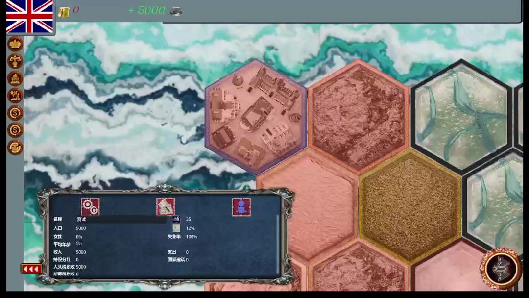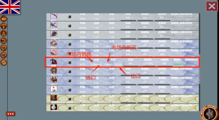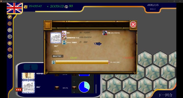 贸易系统现已制作完毕。一个国家可以设置临海的地块为贸易港口(贸易港口上限随着国力的增强而提高)。当本国的商品出现供大于求或求大于供时,资本家会综合各种因素,最终找到利润最高的国家,并进行贸易。两国贸易港口的距离,会算作贸易成本。如图所示,英国生产了大量的衣物,并出现了供大于求的情况。而隔壁的法国急缺大量衣物。此时资本家就将本国的衣物倒卖到了法国,并赚取了大量利润。