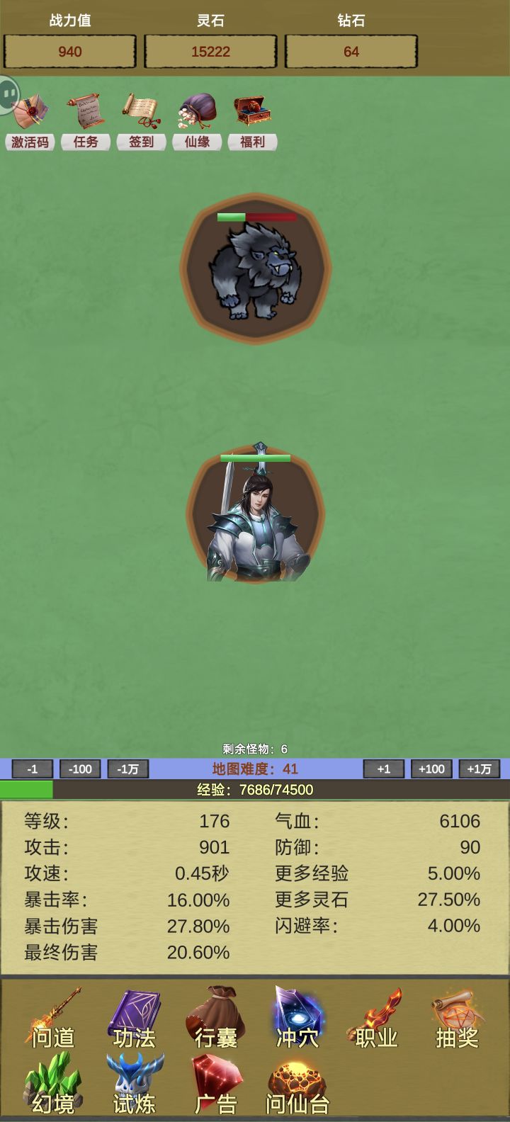 游戏基本功能都没做好就测试了,广告看不了,职业属性没有实装,冲穴属性没有实装,问道大部分属性也没有实装