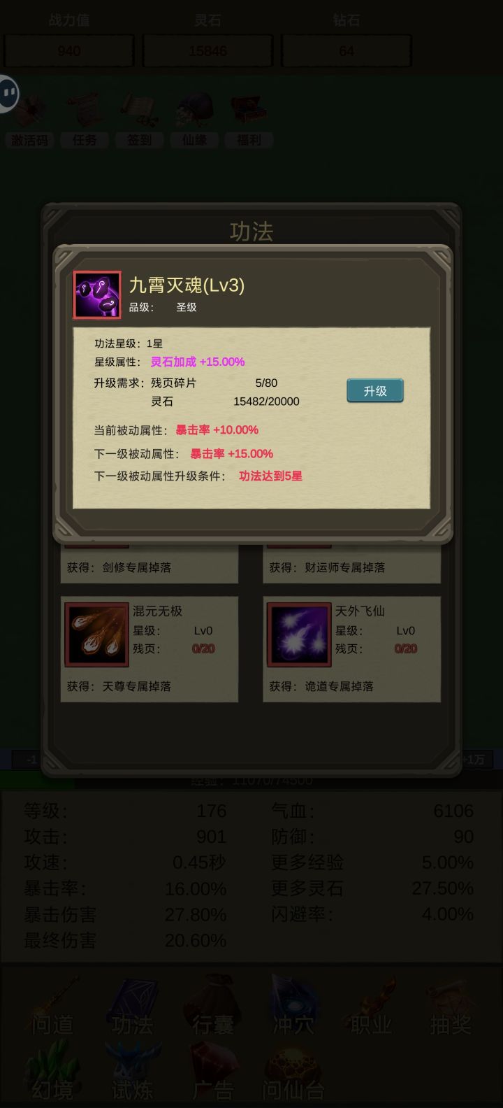 功法抽出来是假的? 这一本功法 提供百分之十暴击率 结果还是属性面板还是百分之十六