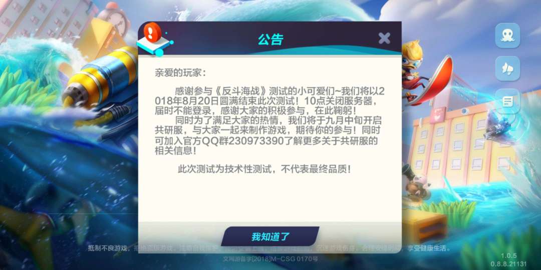 亲爱的玩家: 《反斗海战》的精英玩家删档测试将于12月26日17:00结束,到时会关闭服务器,再次感谢大家的参与! 您可以加入官方QQ群:230973390 寻找伙伴一起组队开黑!如果您对游戏有任何的意见与建议,也欢迎前往QQ群进行反馈! 当前版本为测试版本,不代表游戏最终品质!