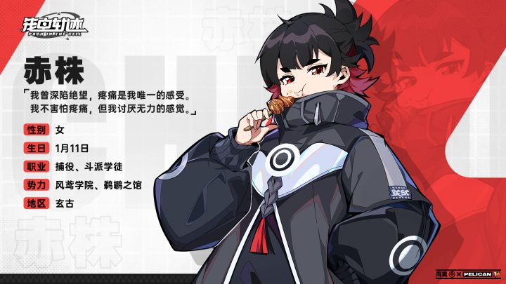 各位越界者上午好~今天嘀咕妹要给大家介绍的是新来的吃货不对不对,是我们的新角色——赤株赤株是风鸢学院的斗派学徒,同时也是巡检司的捕役,负责抓捕穷凶极恶的罪犯。以下是嘀咕妹打听到的小道消息:◆ 赤株对自己的身体拥有极强的掌控力,并且天生对疼痛的耐受力远超常人。◆ 赤株爱吃自助、睡大觉以及玩VR游戏,巧克力和土豆炖牛腩是她的最爱,对于蔬菜赤株则表示