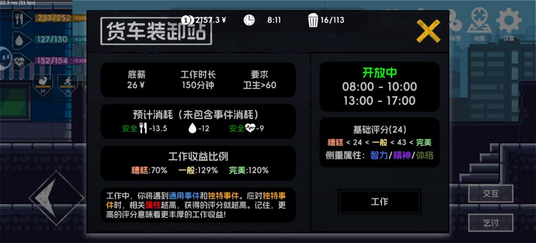突然发现一个很无脑的玩法,现在还有很多人再为饥饿,心情而困扰,不是在打工就是想办法搞钱,这游戏为的是什么,为的就是活下去,从而我发现,只要不生病不受伤,状态就不会呗影响,还有人说什么不能喝酒不能抽烟,容易掉状态,那都是矫情。 现在告诉你只要不捡垃圾吃不去翻垃圾就不会出现生病的状态,然后看到商店就进去窃取,虽然不会一次就成功,是不是怕被发现后进不了收容所和公厕?一个店可以反复的进反复的窃取知道成功为
