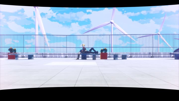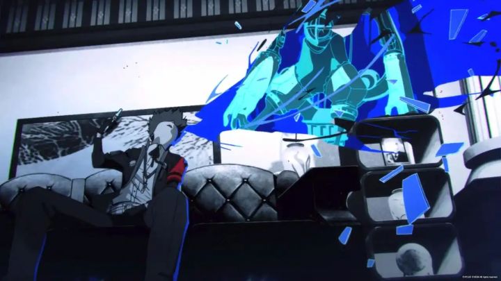本作完美继承P5式UI设计,以带有忧郁感情引导的蓝色为主色调,模拟海面,主人公结成理(Yuki Makoto)溺于水中,围绕人物自身旋转进行切换,此为一大伏笔