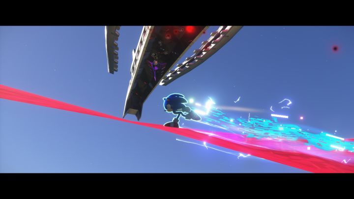 索尼克中也采取了部分灯塔引导的方式,地图中有着很多直冲天际的光柱他们就像野炊里的神庙和瞭望塔一样,大老远就可以吸引玩家的目光。不过引导玩家过去的方式本作就大不一样了,可以说是最索尼克式的引导。在一个个关键的节点之间游戏设计了许多精巧的轨道、平台和机关组成了一个个小关卡,在完成一个目标点后你可以在周围发现很多这样的地方,你可以顺着这些设计好的关卡,爽快快速的以一种十分索尼克的方式快速前进,有的是直接几段相连的滑轨配合几处加速环,有的是一连串的平台跳跃,还有的是几个连续的加速带,而后面等你熟悉之后制作组又会将这几种方式组合然后组成更长更刺激的路线,整个开放世界都是被这种小关卡串联了起来,在各个地点之间移动时时永远也不会让你感到无聊。