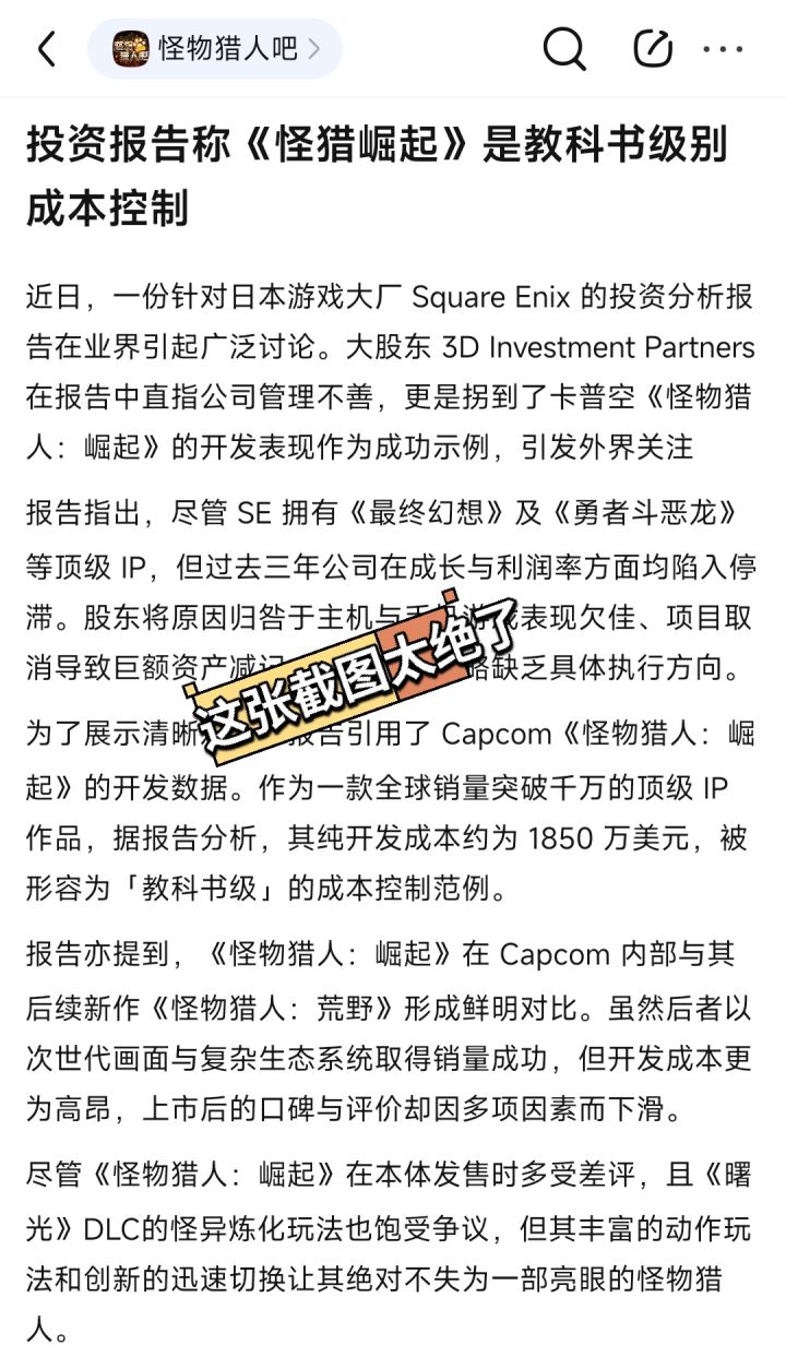 被誉为教科书级别成本控制卡表真行啊,花小钱办大事,成本压得死死的,还能做出爆款游戏其他厂商得好好学学怎么精打细算#主机单机 #怪物猎人 #游戏资讯 #怪物猎人崛起