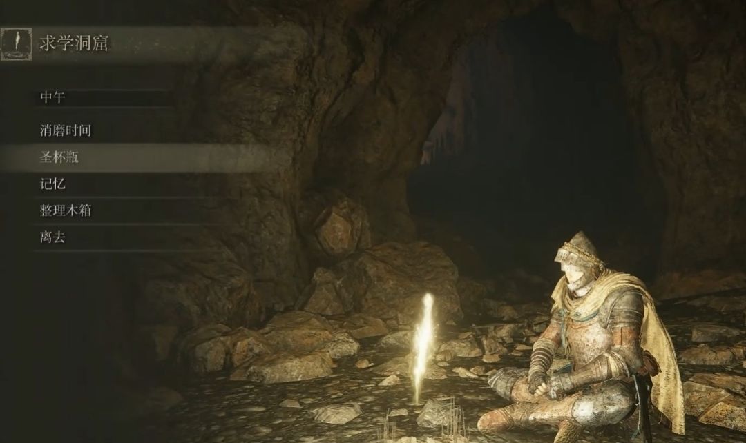 求学洞窟 剧情杀BOSS战后醒来,与椅子上的NPC对话,他让你到下面学习战斗。从他面前的洞跳下去,来到求学洞窟。可学习攻击、防御、潜行攻击、双持、防御反击等基础操作。 赐福 赐福其实就是黑魂里的篝火,触碰赐福即可解锁传送点,方便以后传送回来。 死亡后,会在最后休息的赐福复活。如果死亡地点附近有“玛莉卡楔石”,也能选择在那里复活。 在赐福休息能完全恢复血量、专注值,治愈异常状态等等,也能补充圣杯瓶。