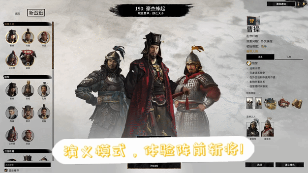 即使多年过去,三战依旧是三国题材战争策略游戏中一颗璀璨明珠。【足以考究的历史让人着迷】打开三战的界面,仿佛就是打开了一本通俗易懂的历史书,你几乎无法相信这是一款外国人制作的游戏,无论是角色的服饰外貌,还是角色特性所关联的人物史实,都高度遵从于《三国志》的剧情设定,从黄巾起义到八王之乱,数百年的历史浓缩在了本体和DLC的加载之中,你可以顺应历史,用书本中的操作打出一样的结局,亦可以