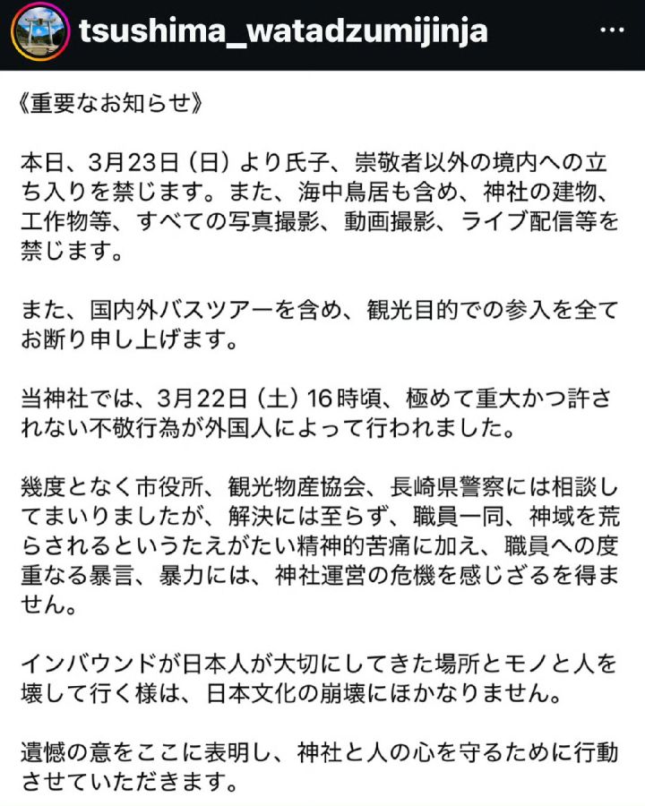 作为《对马岛之魂》游戏中神社的原型、位于日本长崎县对马市的和多都美神社,近日发布公告宣布将拒绝所有观光客进入,原因是“外国人犯下了严重且不可饶恕的不尊重行为”。据报道,此前有游客在神社内吸烟、吐痰、大声喧哗,甚至个别游客还做出了破坏场景和谩骂神职人员的暴力行为。神社去年曾明确表示拒绝韩国游客进入,此次则将禁入范围扩大到了全体游客。#对马岛之魂 #主机单机 #今天游戏圈发生了啥