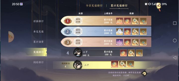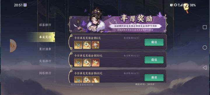 截图是单笔充值,不是累计充值,亲,单笔充值必须在古玉界面充值,买礼包不算单笔的