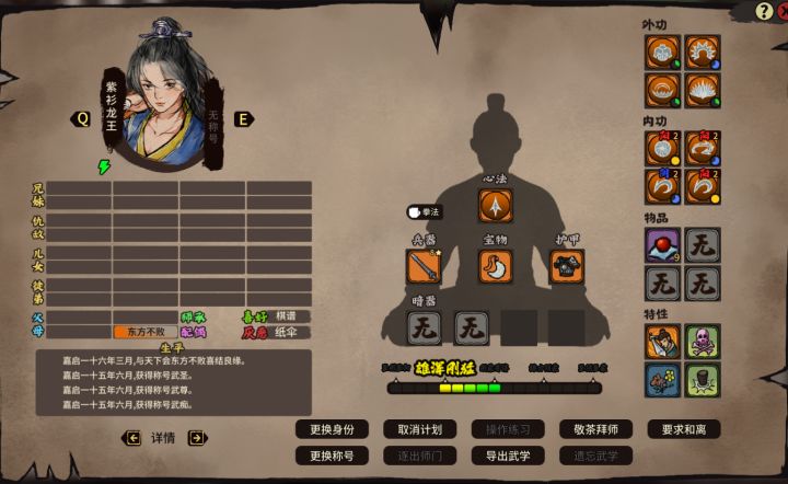 江湖录过来人攻略 天赋绝世之才和巨服提升血和伤害的是最好的。宗师和英雄天赋没什么用。(绝世之才是巨副增加暴击暴伤)江湖录攻略, 开局五人,掌门选绝世天赋 之后两个紫色弱伤,一个紫色加伤害的。之后4弟子,一个是一脉相承 大厅主管的夫人,一个是英雄之资加铁匠天赋的保镖。之后是招募大厅和闭关天赋的管家,之后是藏书阁和练武天赋的秘书。(炼丹其实不重要,前中期很少需要吃药)。每人后两个都是老谋深算 老