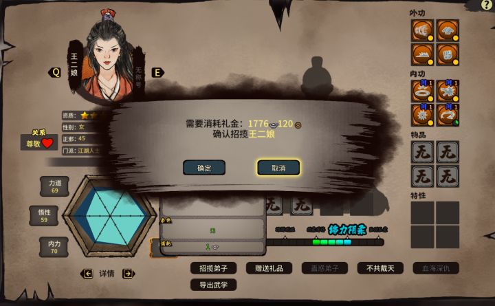 收的第一个七星,其他两个称号的高手,有不加门派的天赋。收她花了1800银两,礼物花了1000两。用苗刀没想象的碾压,武功多是团战加成。