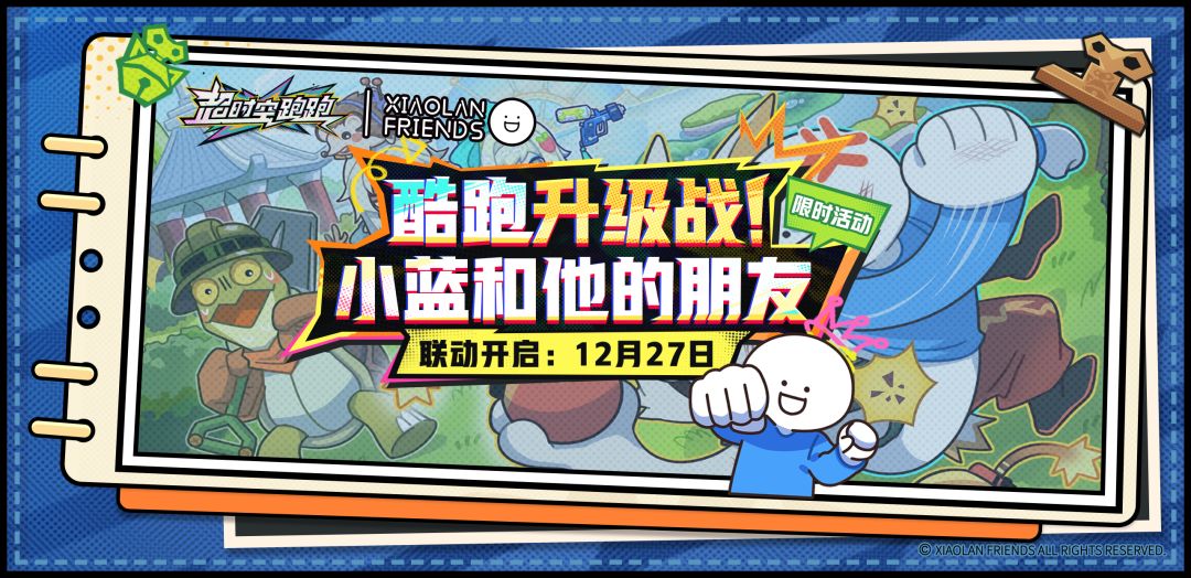 12月27日公测开启当日,《超时空跑跑》x《小蓝和他的朋友》联动同步开启!联动第一期,肉鸽版跑酷玩法,“酷跑升级战”爽快来袭!君子动口,动手,更斗表情包! 在本玩法中,追光者们可以体验从一无所有到应有尽有的奇妙体验,在小蓝表情包之力的加持下暴击不停,“创”飞一切阻碍!完成联动活动,更可获取【加密相纸x10】、【金曜希望蛋】、【小蓝联动专属表情包】及【限定头像】等奖励。查阅下方图片,收获最