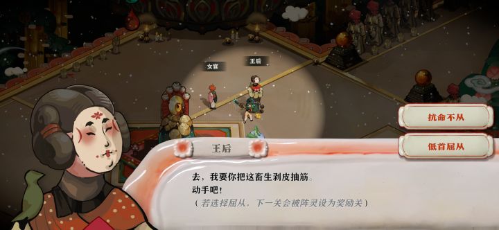 被这款游戏独特的画风吸引进来,整体效果很惊艳,可能与其他肉鸽游戏相似,但被游戏的唐式风格、美术形象、独特的背景音乐、略带血色的剧情所吸引。