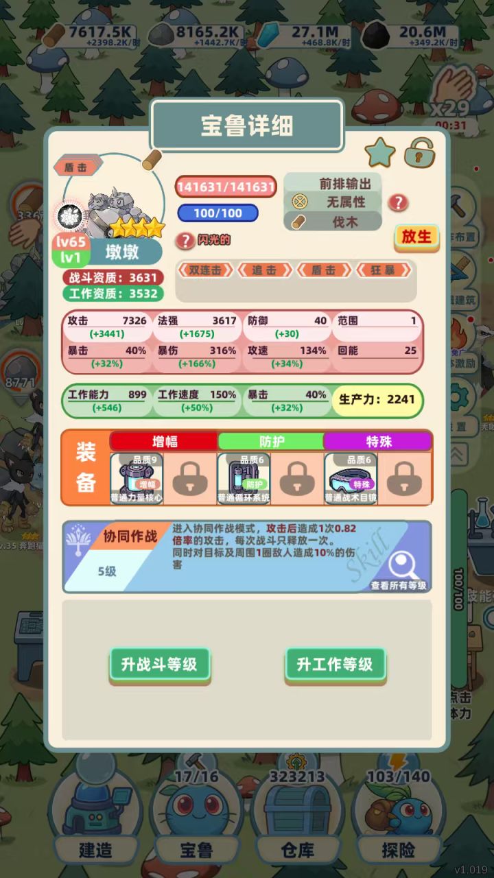 宝鲁种类很多,每一种宝鲁与产出资源绑定,让其工作只会获得这一种资源。出战和工作数量由建筑决定,战斗有近战和远程攻击方式差别,存在少许组合搭配策略。单只宝鲁有战斗和工作双重等级,从字面意思就很好理解,教学也有提及。另有装备和技能等级养成,解锁稍慢。