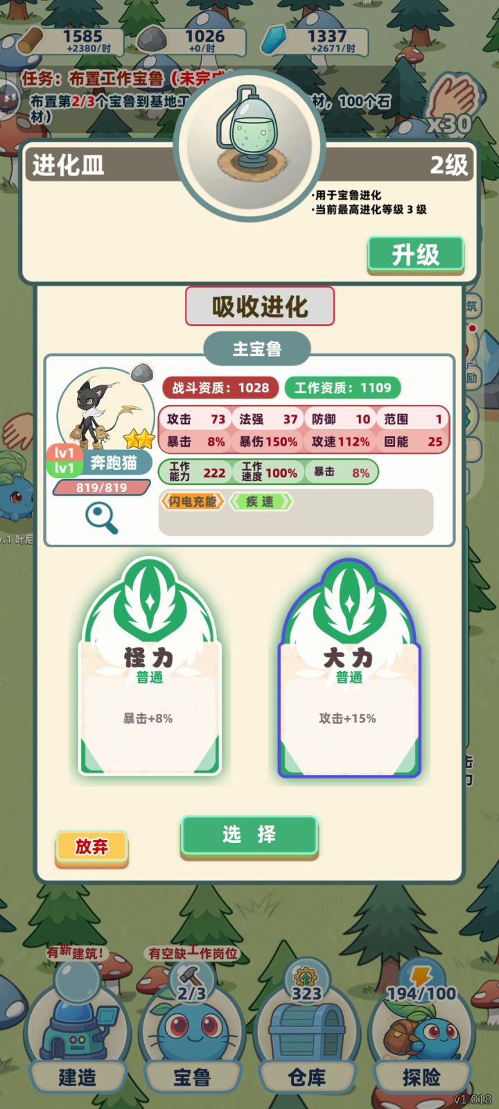 刷宠物的进化词条,根据宠物词条的不同,可以分为打工宠和战斗宠,前期可以培养打工宠,可以更快的发展科技,升级科技需要大把资源。战斗宠,前期先培养一只强力输出的,加油推图。