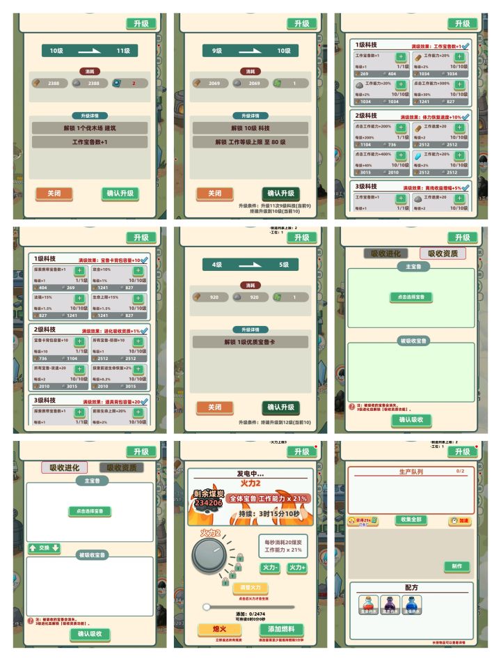主要的进程升级终端:需求终端芯片放置式开采:木材、煤、石头、晶石其它附件:工作台(需升,提高鲁米卡的品质)、进化皿(需升,小吐槽不如叫升阶、主要工效每升一阶增加一条消耗者的其中一个技能)、科技、战斗研究台(需升,分别加点资源与战力每小格填满会额外激活能力)、坩埚(需求低,主要工效制造药水)、熔炉(需求看个人,能够打造装器,可以有一部分的效果提升)、基因改造台(看个人,能够改变选择的鲁米一个技