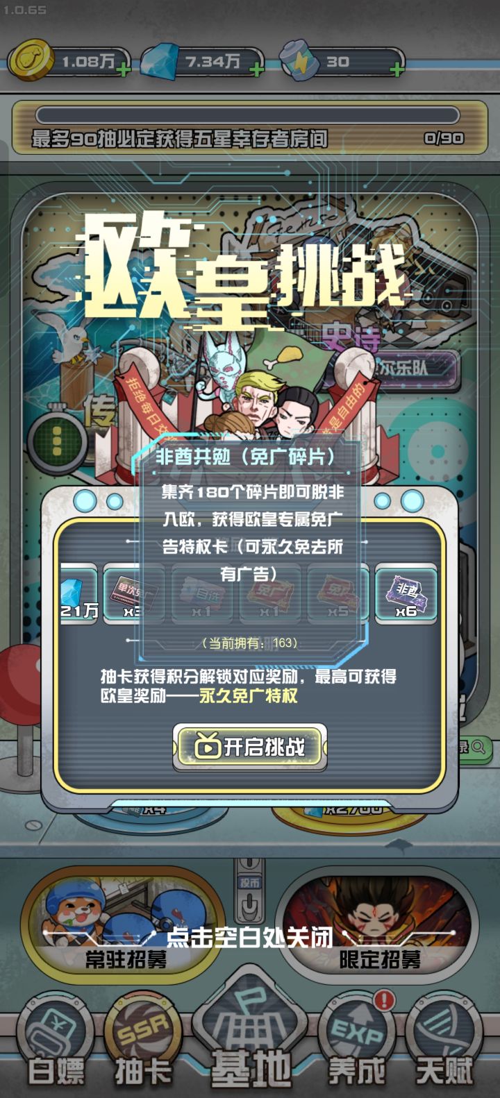 游戏的抽卡继承了【超神网络】的经典机制,300抽欧皇挑战,将游戏资源进行了等级划分,抽到不同等级会分别积分核算,按照最终分数给予玩家奖励,或是免广告卡,或是免广告碎片,这种方式解决了两个问题: