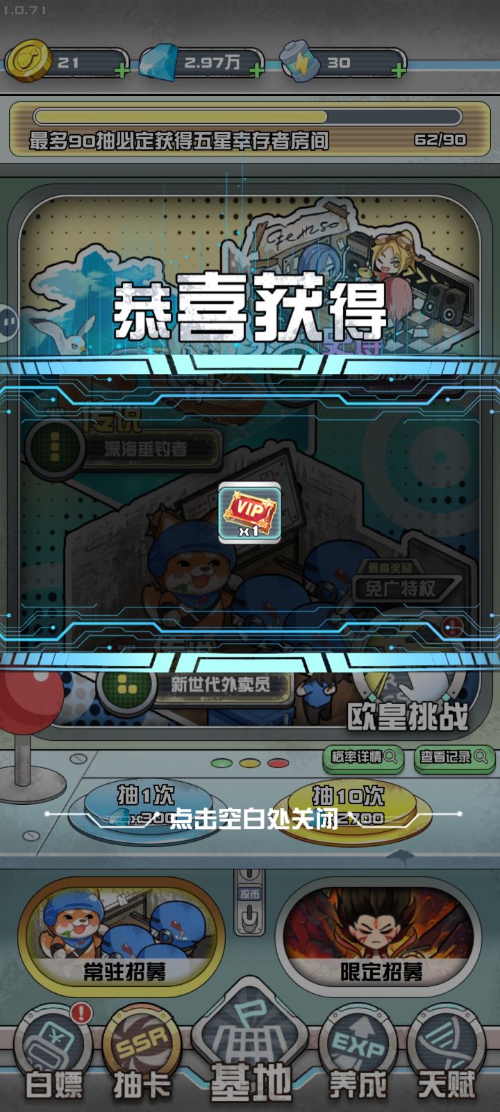 1、无版号游戏无法进行任何收费行为,在游戏内添加广告会引起玩家的主观厌恶,以攒资源的方式让玩家进行欧皇挑战,在抽奖概率完全透明的情况下,极大的减小了玩家的游玩压力。