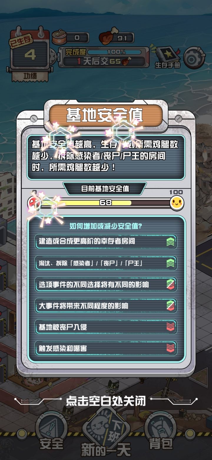 游戏内有很多巧思,比如在游戏关卡内,玩家可以点击飞行的丧尸和地上游荡的丧尸提高安全值和获取资源,增加了随机事件文本让游戏的每一天更好玩,房客有不同的占地大小,更加富有策略性,房客致敬了很多游戏动漫电影角色,在养成界面是看不清楚的,玩家需要携带后在关卡内放置后才能完全看清。