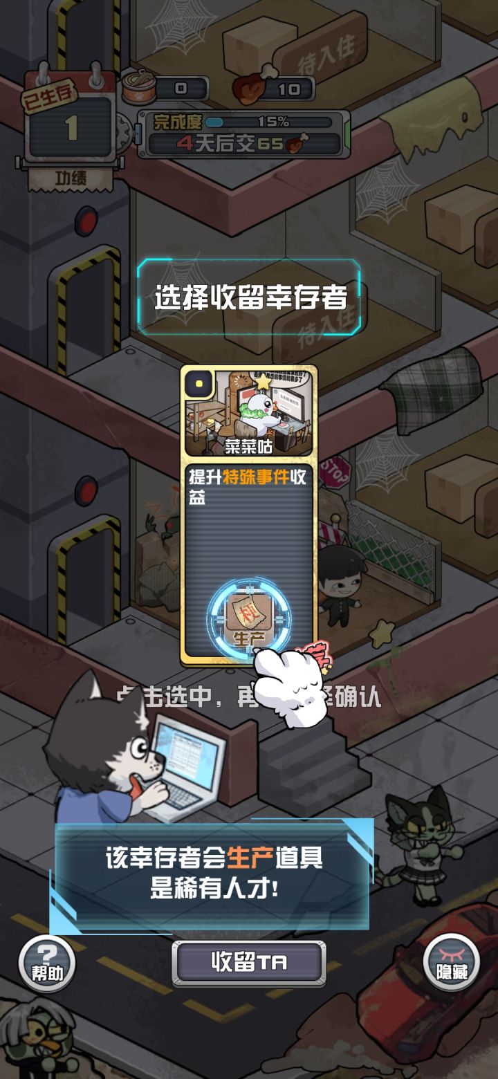 局内养成是每到下一天的rouge选择,玩家这个时候需要从三个房客中选择一个,然后合理安排房客住宿的位置,游戏给玩家提供了初始的3×3房间,两个一星可以合成一个二星,以此类推,同样房客可以合成升星,提供更加强力的效果,玩家可以在每天后消耗罐头等资源购买道具,增加属性或者扩建房间,每个房客都会提供不同的资源,核心资源是【鸡腿】,玩家需要在指定天数提供要求数量的鸡腿,未完成数量则游戏失败,鸡腿数量随着游戏进行天数增加而增加。