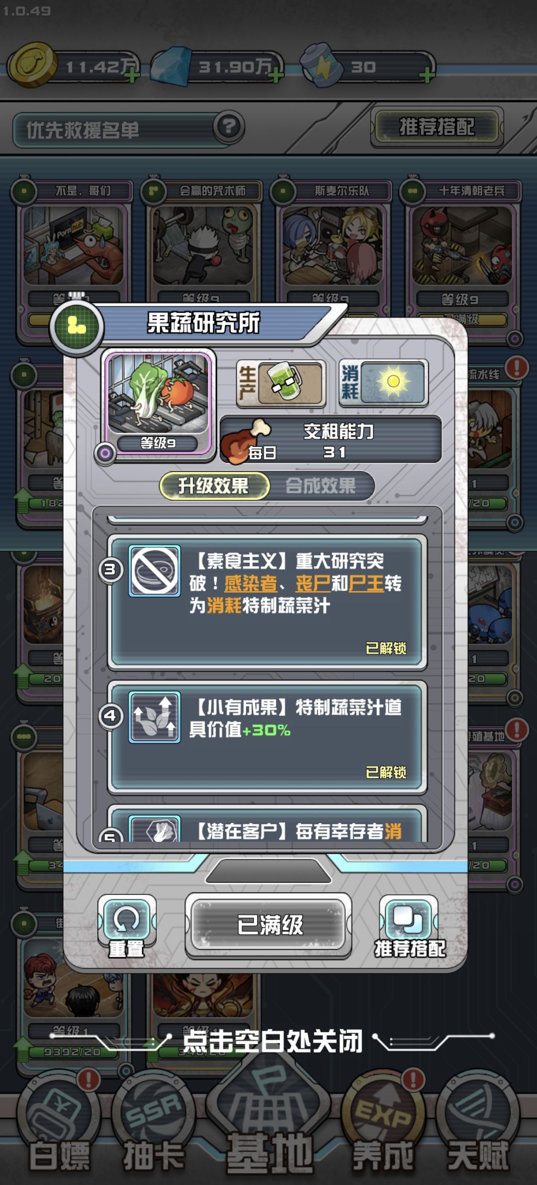 1、阿巴阿巴 全体每天额外生产一次(⭐⭐⭐⭐) 2、大型基地 基地大小换鸡腿 一格给30 3、竞争意识 1星幸存者越多五星者基础产出越大(感觉没啥用还贵,或许养丧尸流用的上?) 4、火力覆盖 增加对僵尸50%的伤害,(不想点僵尸的可以用,就是头顶飞过来的,罐头多可以买,但是不推荐) 5、龙之觉醒 直接让龙蛋变成一星祖龙(平常祖龙是四星灵兽10%的概率进化来的四星灵兽很难搞除了卡BUG)(⭐⭐) 6
