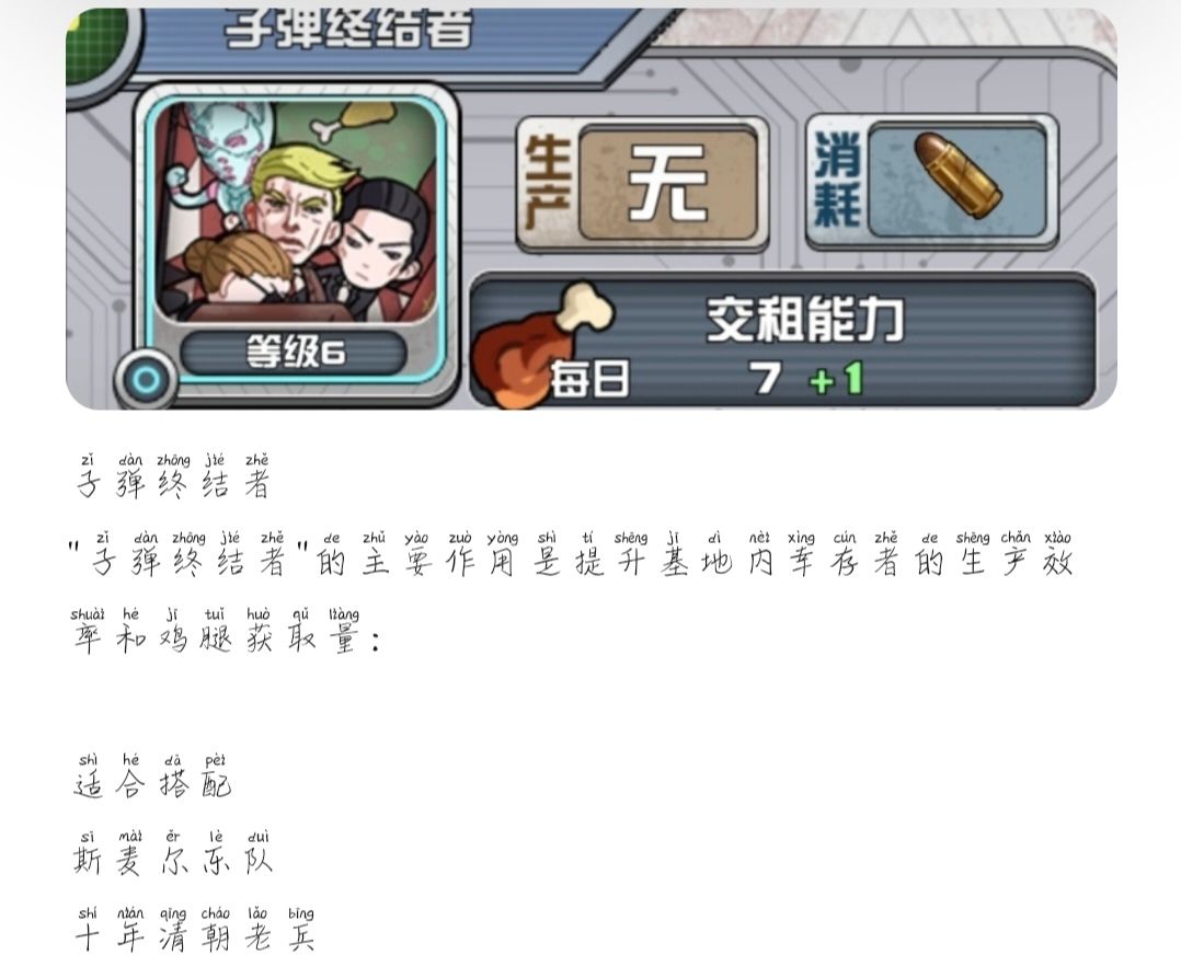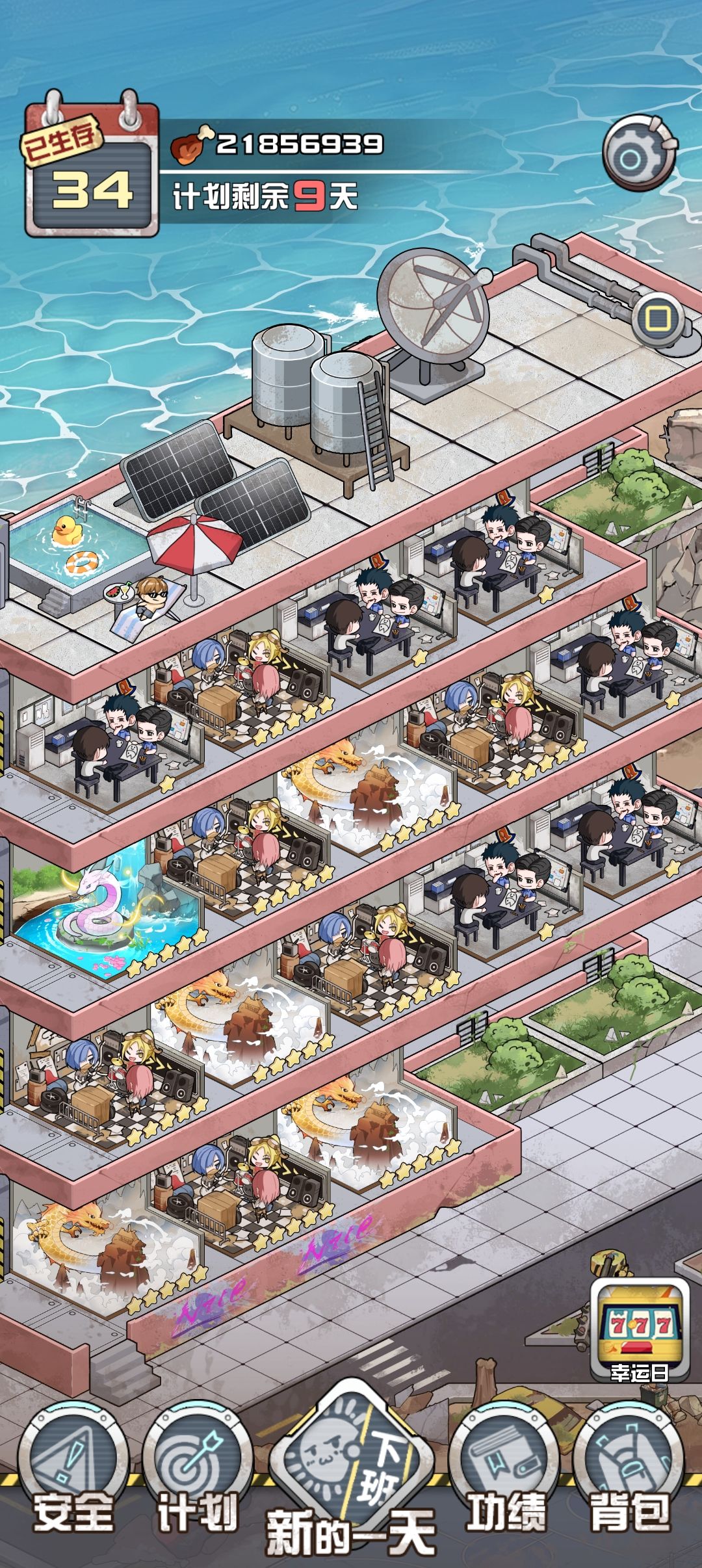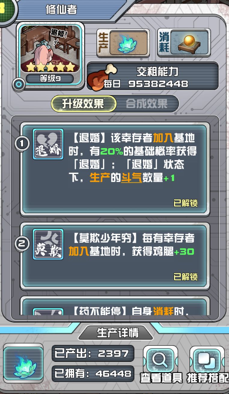 第四关,从六万之后有点难度,10天12万,12天36万通关,这把最后大概有五六十万,几乎富裕了一倍的量。🍗38万多,其他的都是物资。 核心就是茶妹,发电机,加上黑心企业家。 企业家有就选在有效期结束前合星,有效期应该是叠加的,至少合一次增加三天,具体的没有浪费时间测试了。比如你用两个抽的一星合一个二星,就是六天,如果再用两个合的二星合成三星就是12天,如果直接是抽的或许就加三天(没测试,雾)? 场