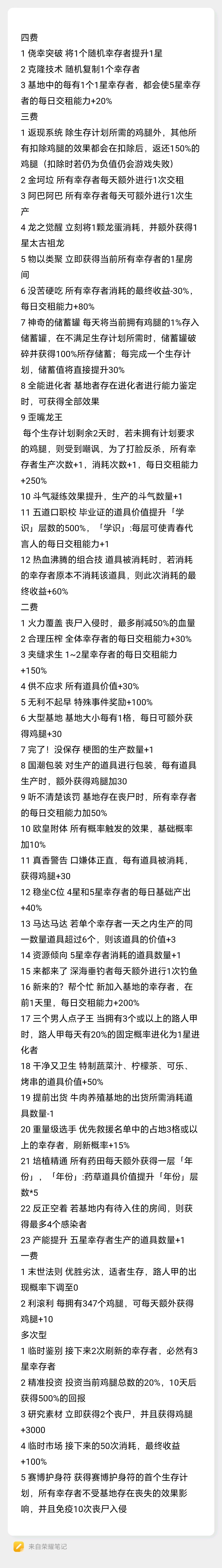 1返现系统 钓鱼流必备因为别的原因扣掉的鸡腿会加倍返还回来(⭐⭐) 2来都来了 深海垂钓者每日钓鱼次数+1(钓鱼流必备) 3无利不早起 特殊事件奖励+100%(啥是特殊事件?就是你每过一天就会有一段半透明的小字写一个故事就是那个东西) 4 资源倾向 五星幸存者消耗+1(提高消耗就是提高产出⭐) 5没苦硬吃 减少一部分消耗 换取大量的(80%)基础收益 6神奇的储蓄罐 这个基本用不到 7配置精通 修
