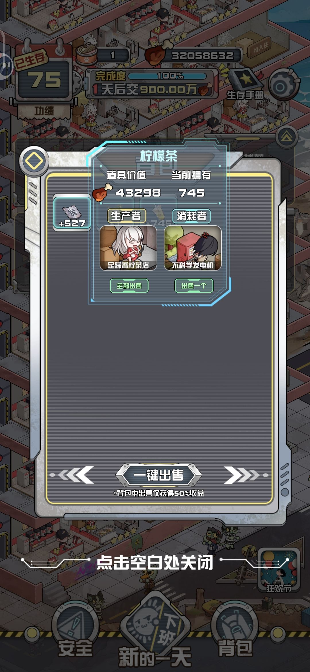 主要靠3级柠檬茶提升价值 4级外卖×666% 前期记得最后一天卖柠檬茶凑鸡腿数 大事件全部都选全场生产+1 异能选加道具价值 加柠檬茶价值 生产次数+1 前期拿格子 中期拿返现 利滚利 末世规则 别的就存着 18天以前别合成 18天结束拿一个全场复制 然后合3级 我是多的才合了4级 因为我带了咒术师 最后64天的时候把除了柠檬茶以外的道具在背包全部卖掉 第10次计划的时候全部买火钳计划 单个道