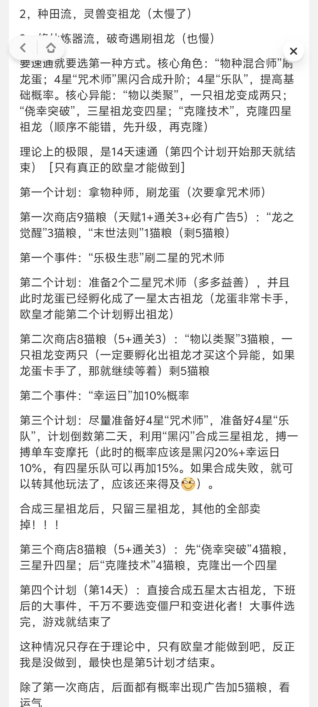 我们开局一个咒术师打底,然后先刷几只新出的鸡哥,差不多三四只就够了,然后鸡哥就会一直生鸡哥了。然后第一次异能可以拿个返现保底(后期返现没啥用了可以拿着前期防崩盘)或者直接上点子王,其他异能就看着拿就好了,房间越多越好。 鸡哥多了之后来个三星围一圈,因为鸡哥不怕感染不怕杀。这样就可以开始我们的养感染者了。然后就是拿炼药师或者豌豆射手喂三星感染者就行了(记得留点一星二星的,免得一下全进化了)没感染者或
