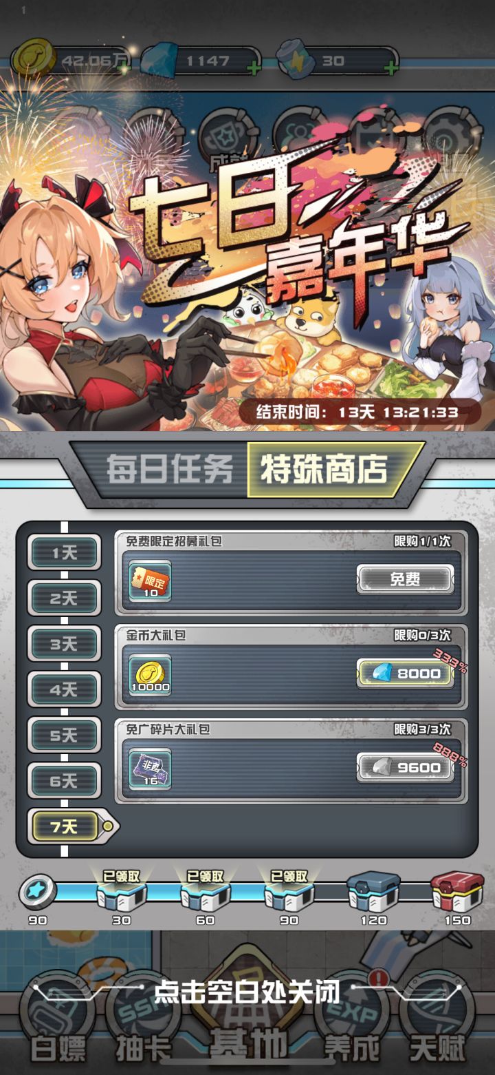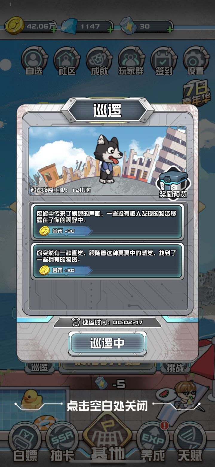 先通关到开启巡逻,手机调整系统时间,每次调整1天,回来拿巡逻奖励,一次有1万左右钻石和抽奖券,7天一个轮回后重启游戏继续。过程把嘉年华的广告碎片买了,剩下不够的就抽奖,只需要看开启挑战的广告,10分钟应该就可以拿到